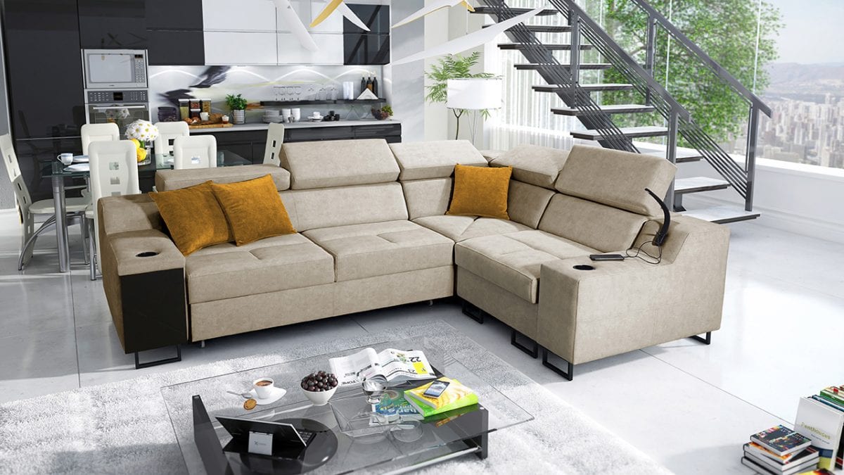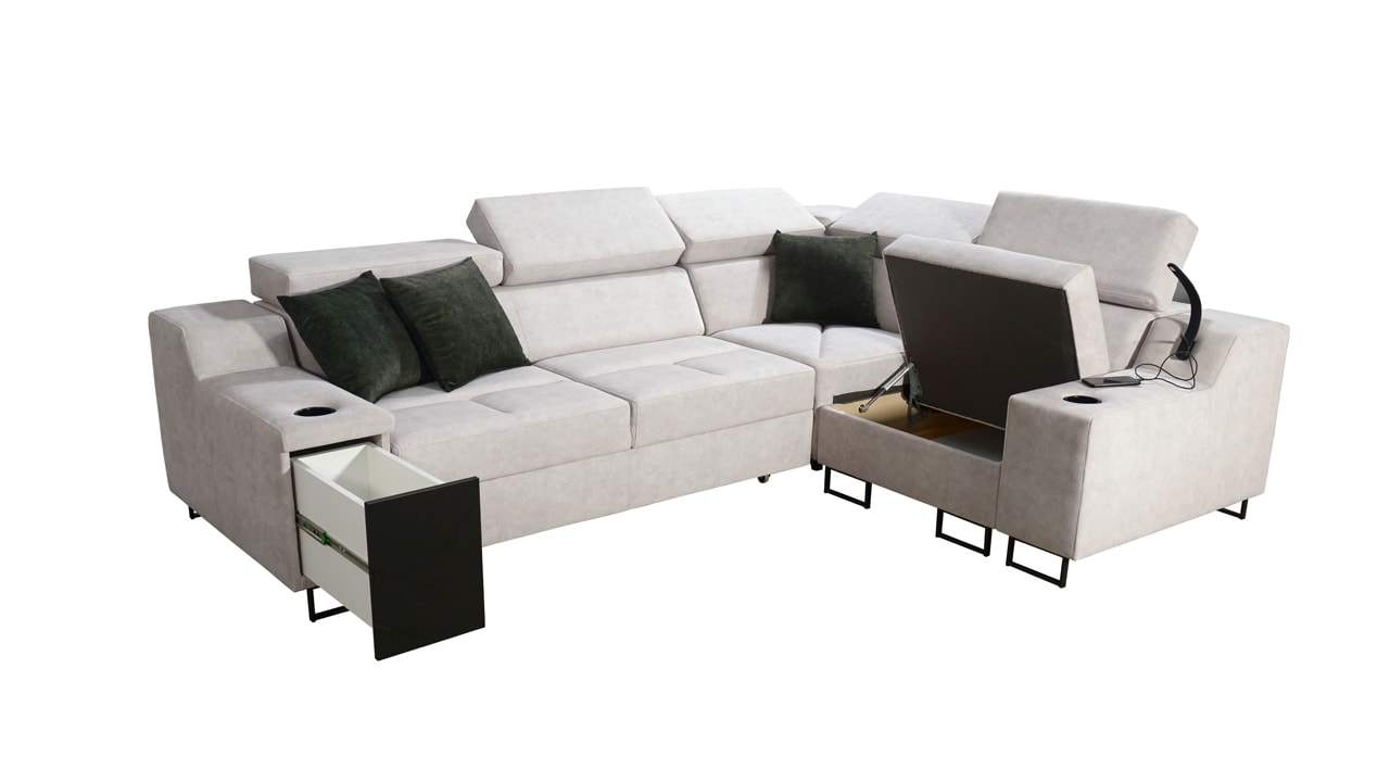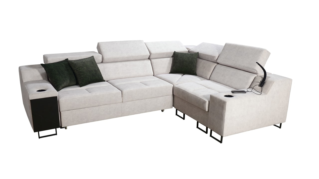 Elegantná, dizajnová a pohodlná rohová sedačka, ktorá je vhodná do bytov aj kancelárií. Typ aj farbu poťahu si môžete zvoliť podľa vlastných preferencií, a preto ju ľahko zladíte aj k už existujúcemu nábytku. Má mierne vyvýšené nožičky, držiaky na poháre, nabíjaciu USB stanicu a vstavaný minibar.