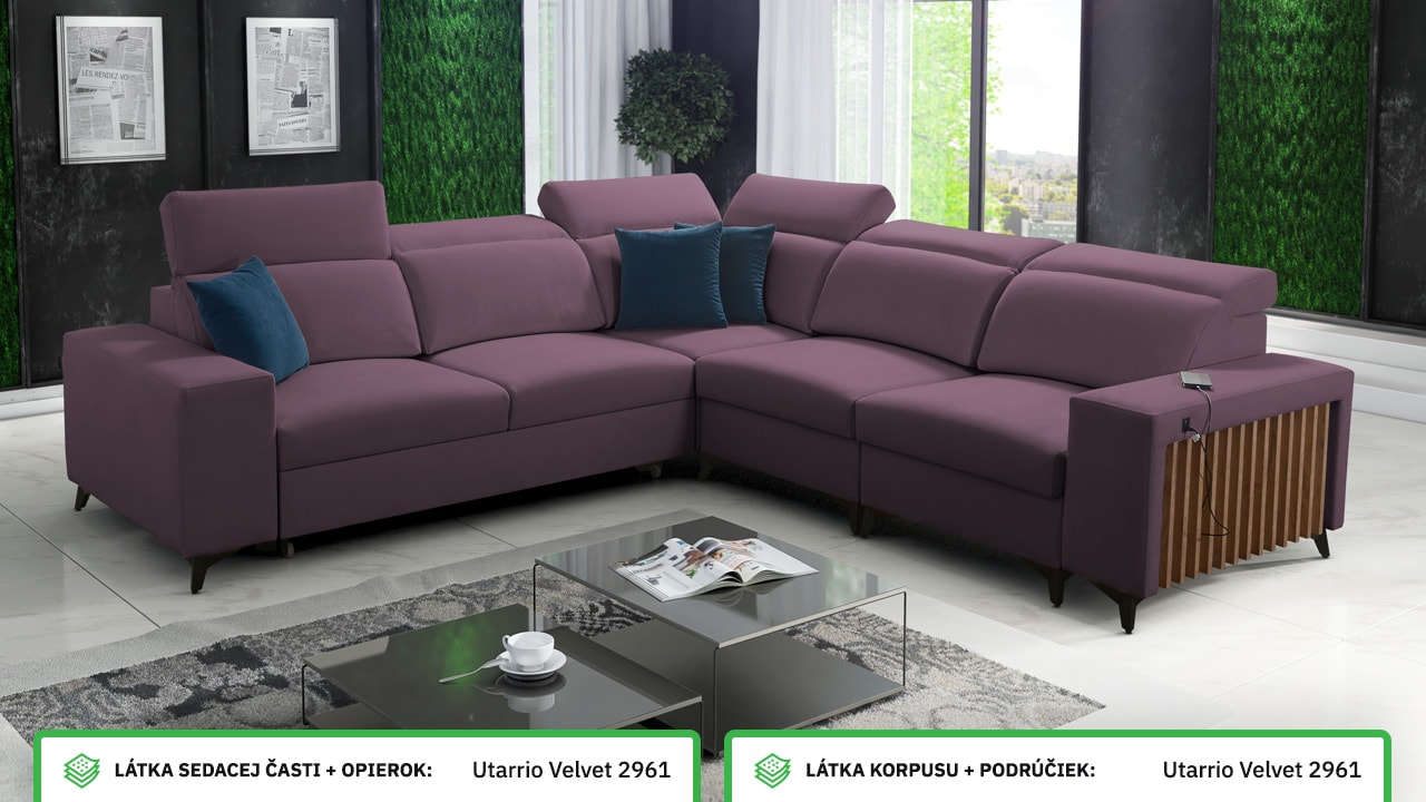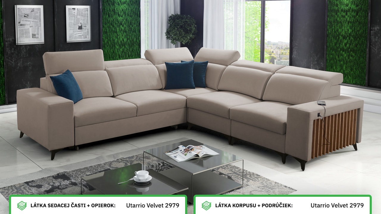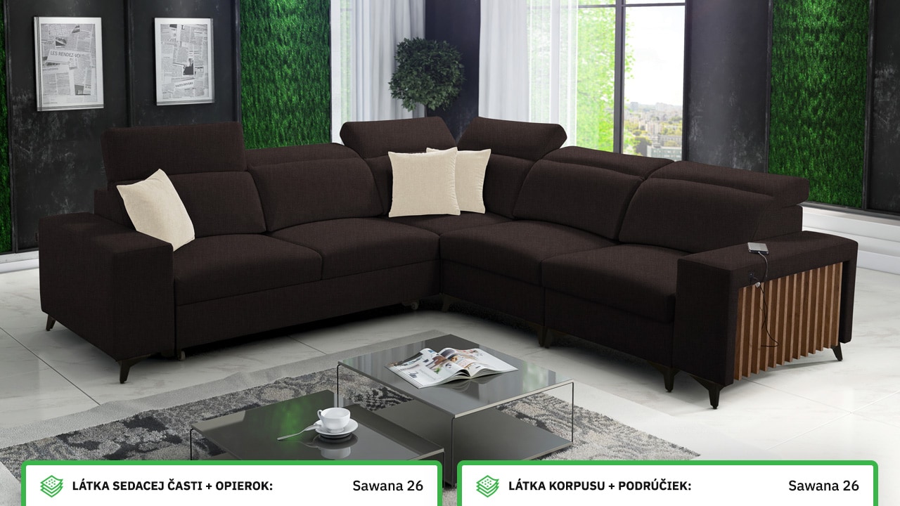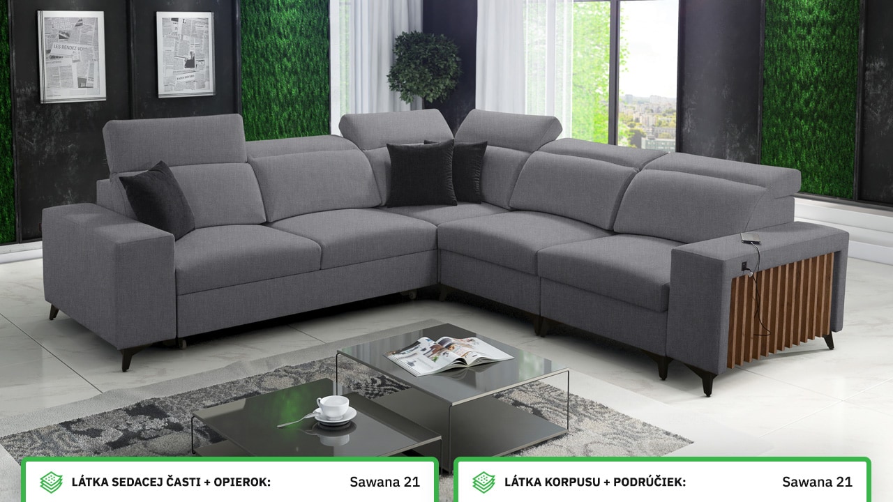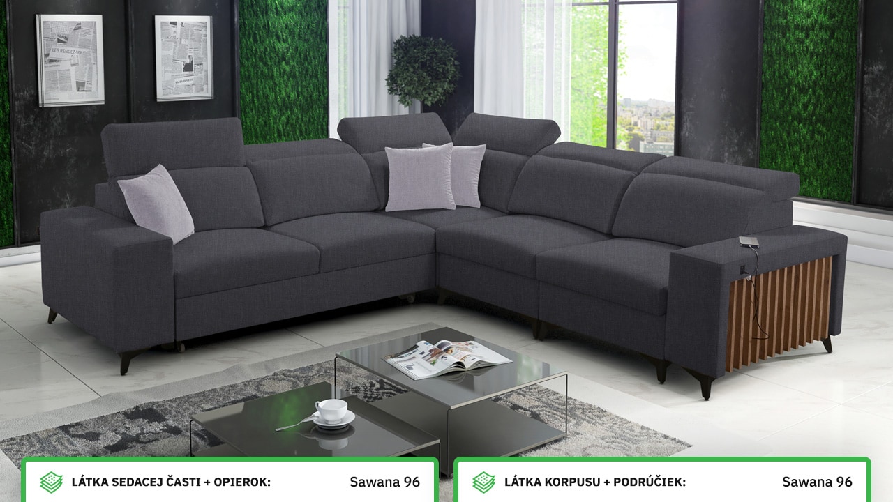 Hľadáte zaujímavý dizajnový kúsok do obývačky či kancelárie? Táto sedacia súprava s jedinečným dizajnom zaujme oko každého hosťa. Je zaujímavá svojím dreveným prvkom, ktorý si môžete zvoliť v piatich farbách podľa vlastného výberu. Okrem toho je sedačka veľmi praktická a pohodlná. Má polohovateľné opierky hlavy, úložný priestor, USB porty a možnosť rozloženia. Farbu poťahu si tiež môžete zvoliť sami.