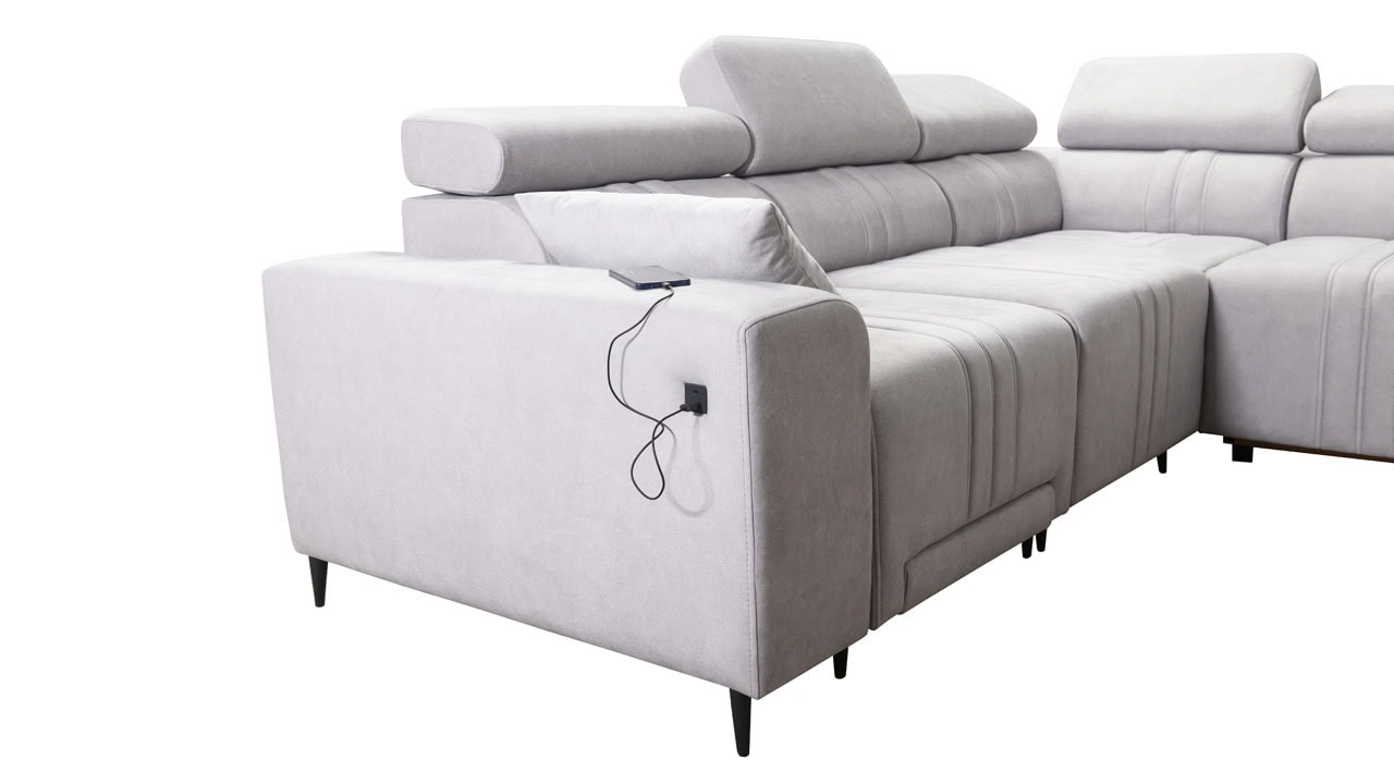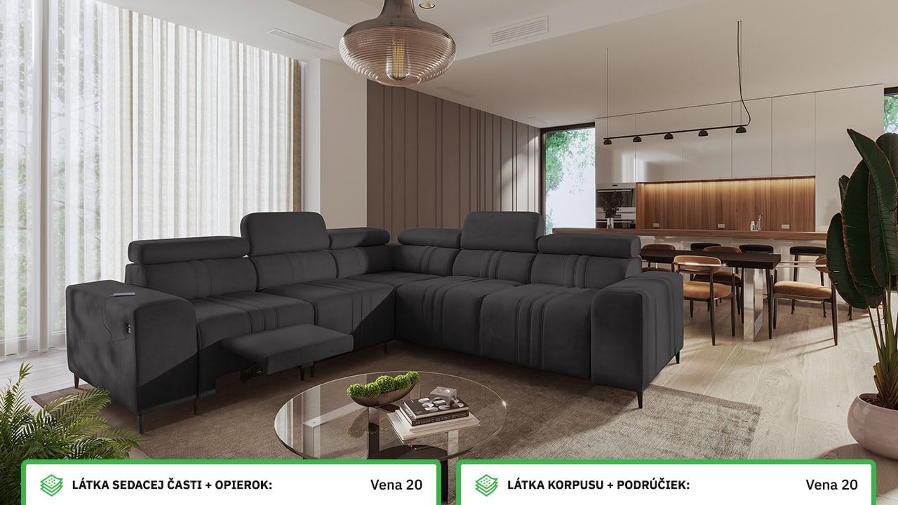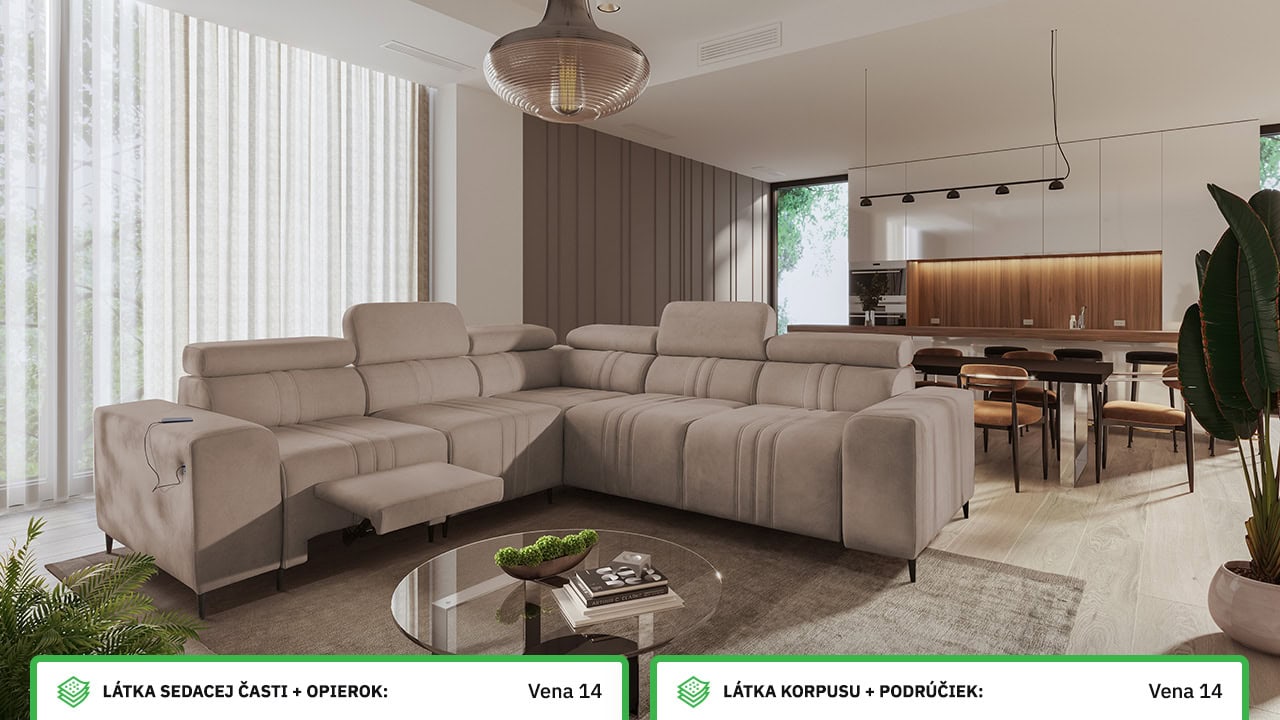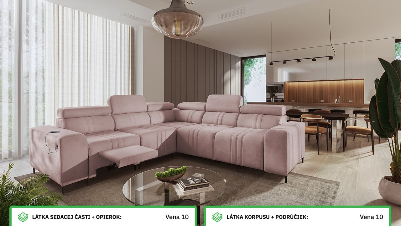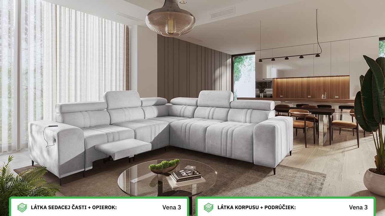 Mohutne pôsobiaca rohová sedačka Fabio III vám poskytne maximálny komfort. Je vybavená opierkami hlavy, nabíjacím USB portom a funkciou rozkladania. Môžete si ju vybrať buď vo variante s úložným priestorom alebo s opierkami na nohy. Krásne vynikne v akýchkoľvek farbách – svetlých krémových či béžových, tmavých sivých a hnedých, ale aj vo výraznejších farebných odtieňoch ružovej, zelenej či žltej. Vybrať si na ňu môžete akýkoľvek poťah z nášho vzorkovníka.