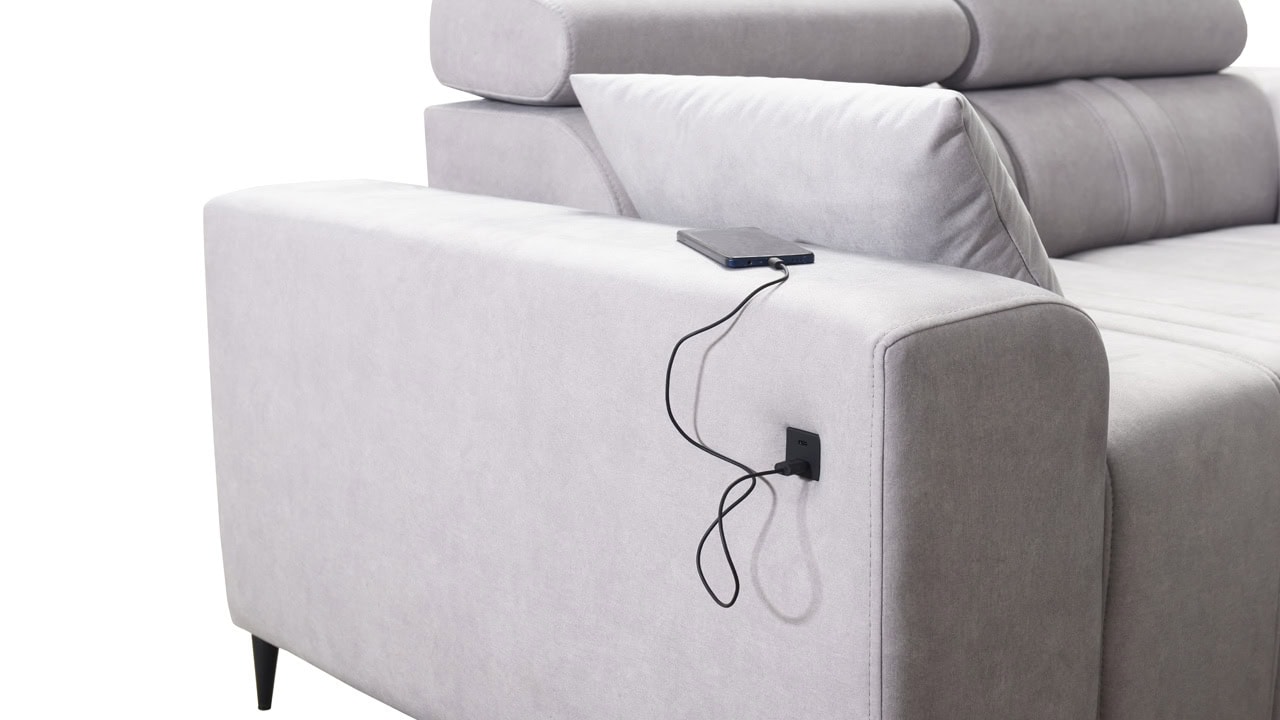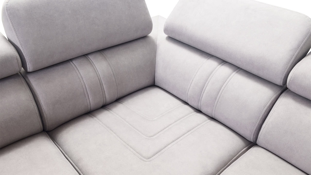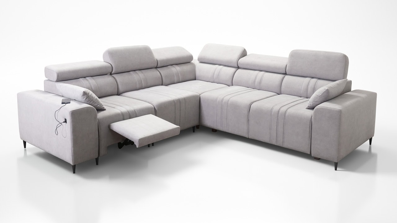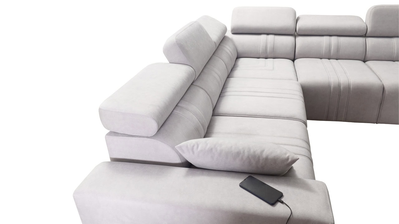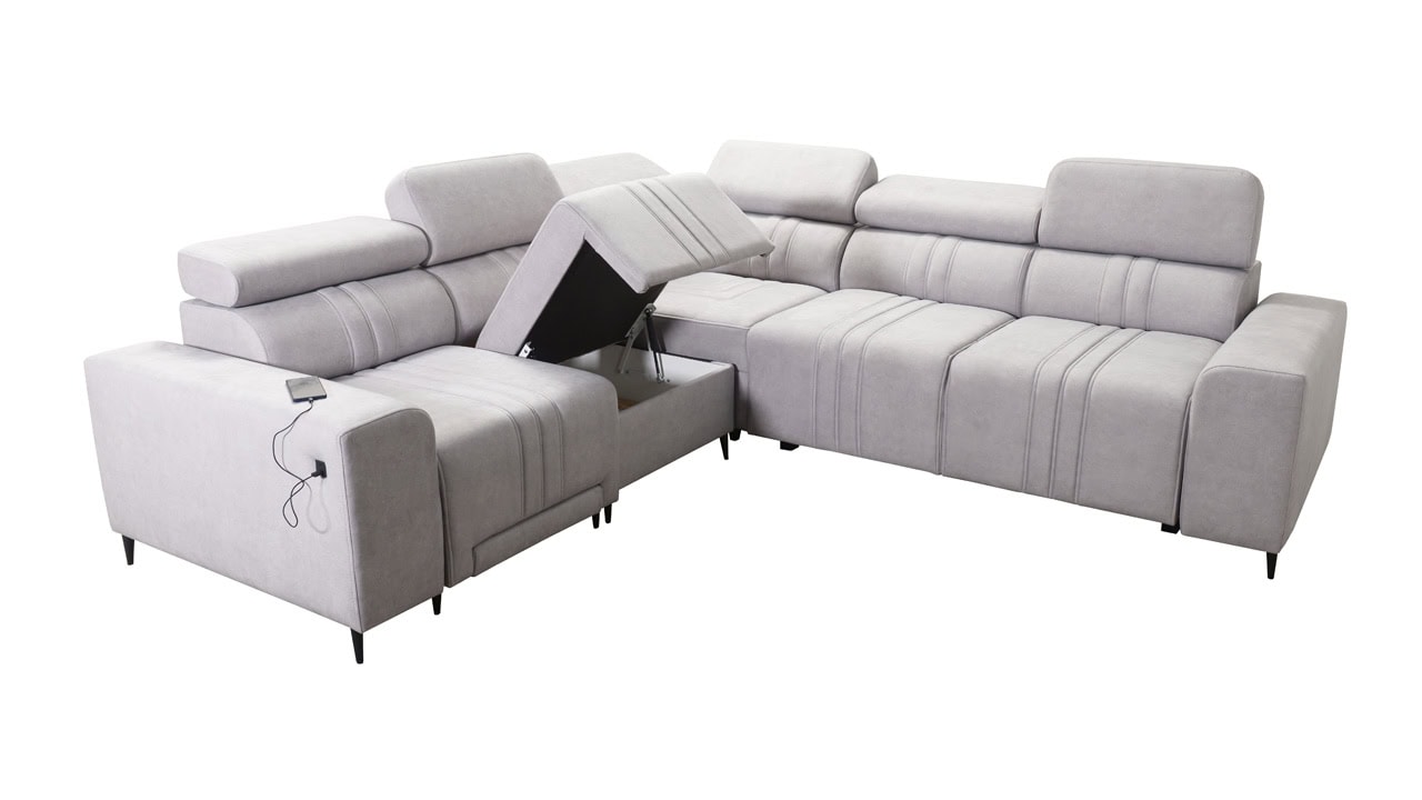 Mohutne pôsobiaca rohová sedačka Fabio III vám poskytne maximálny komfort. Je vybavená opierkami hlavy, nabíjacím USB portom a funkciou rozkladania. Môžete si ju vybrať buď vo variante s úložným priestorom alebo s opierkami na nohy. Krásne vynikne v akýchkoľvek farbách – svetlých krémových či béžových, tmavých sivých a hnedých, ale aj vo výraznejších farebných odtieňoch ružovej, zelenej či žltej. Vybrať si na ňu môžete akýkoľvek poťah z nášho vzorkovníka.