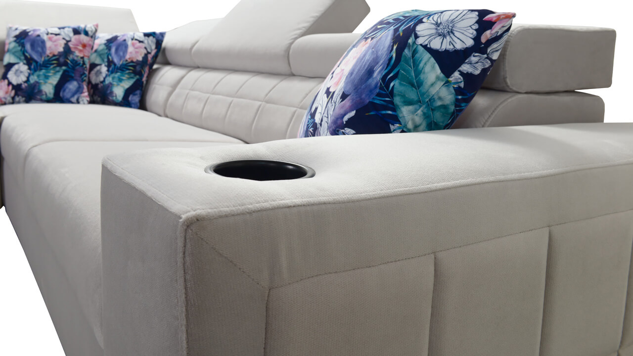 Malá, ale pohodlná. Rohová sedačka GABIIO II vám aj napriek svojim menším rozmerom ponúkne všetko, čo by mala moderná sedačka mať: úložný priestor, možnosť rozloženia, polohovateľné opierky hlavy a vstavaný minibar na odloženie vašich obľúbených maškŕt. Ďalším plusom sú držiaky na poháre a 2 USB porty, cez ktoré si pohodlne dobijete mobil či tablet. Stačí si len sadnúť a relaxovať.