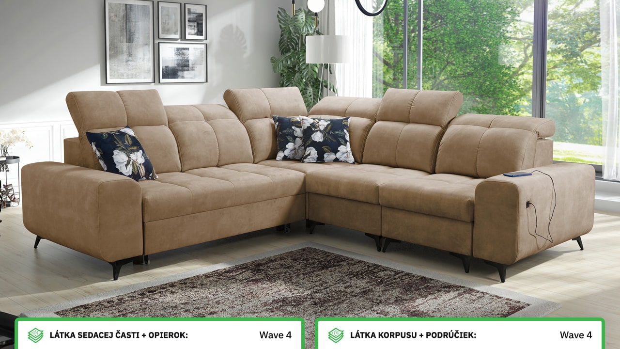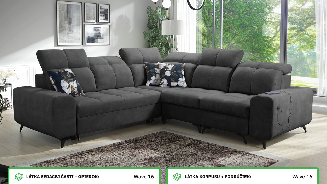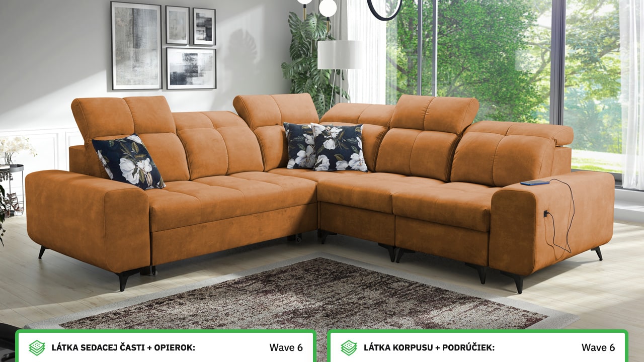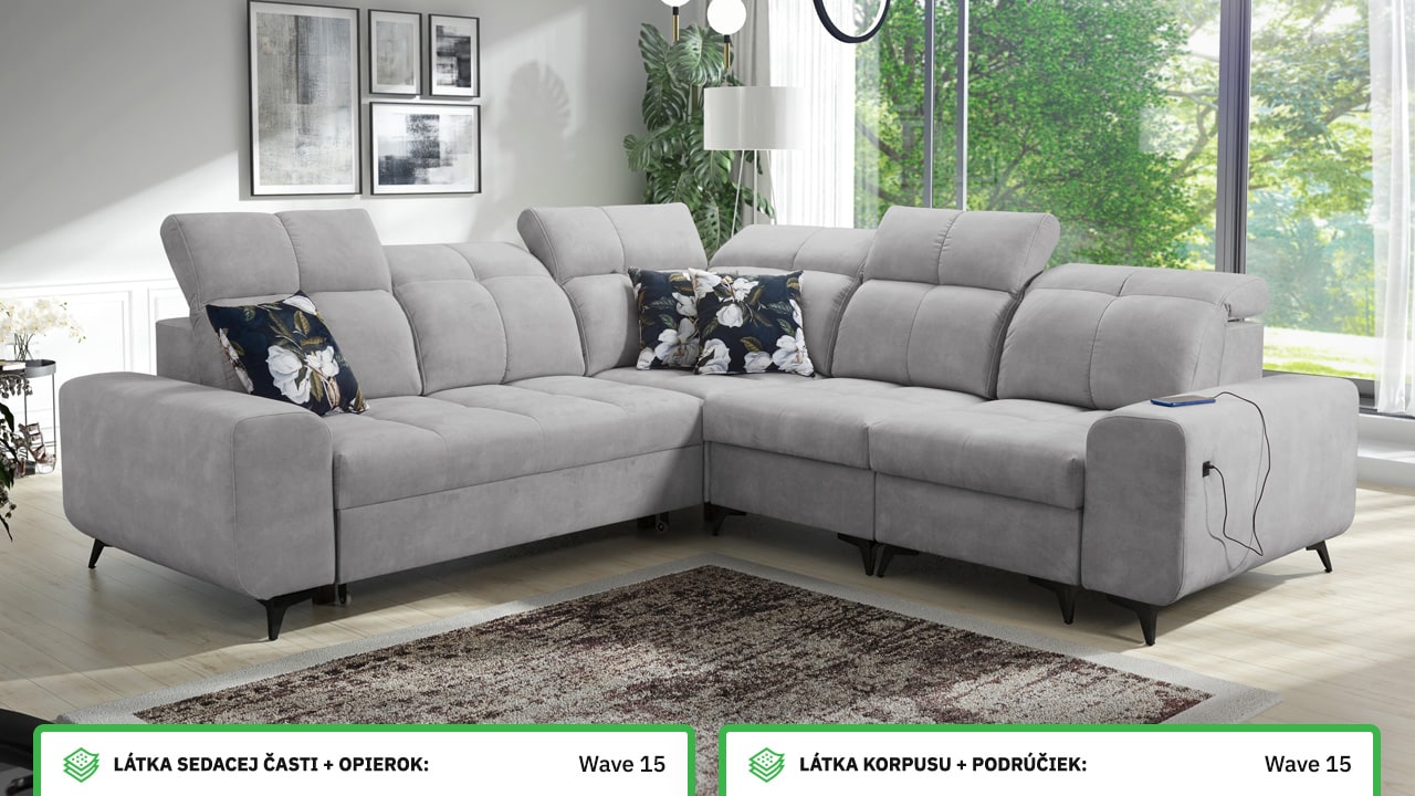 Moderná, elegantná, pohodlná a praktická – rohová sedačka GOLD III má všetko, čo od novej sedačky očakávate. Dá sa rozložiť, má úložný priestor a opierky hlavy si môžete nastaviť podľa vášho pohodlia. Do jedného jej krídla sme navyše ukryli nenápadnú nabíjaciu stanicu na USB port, takže si mobil či tablet môžete nabiť priamo zo sedačky. Stačí si už len vybrať poťahovú látku zo vzorkovníka a my vám sedačku vyrobíme presne podľa vašich predstáv. Sedačku nie je možné vyrobiť v poťahoch Erie, Bristol a Bahama.