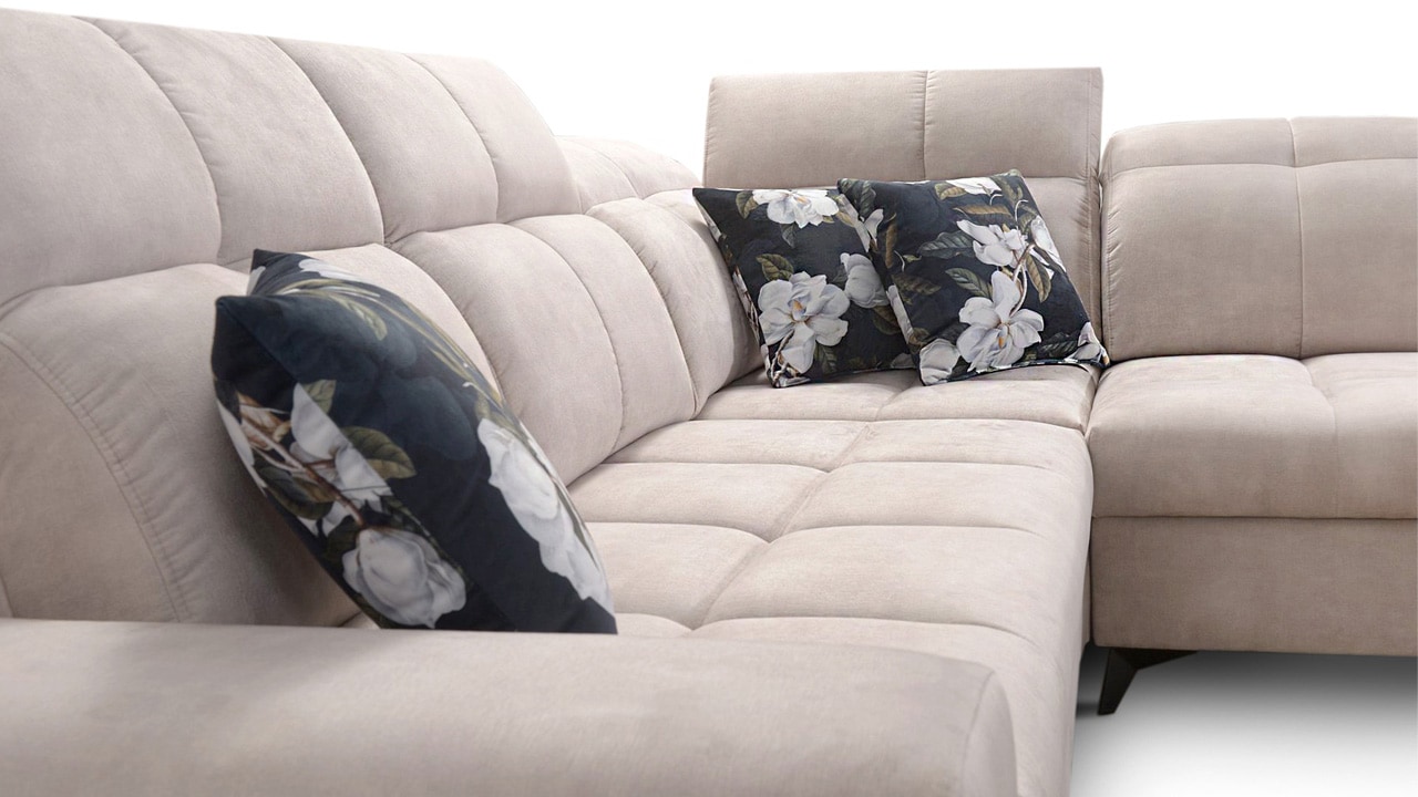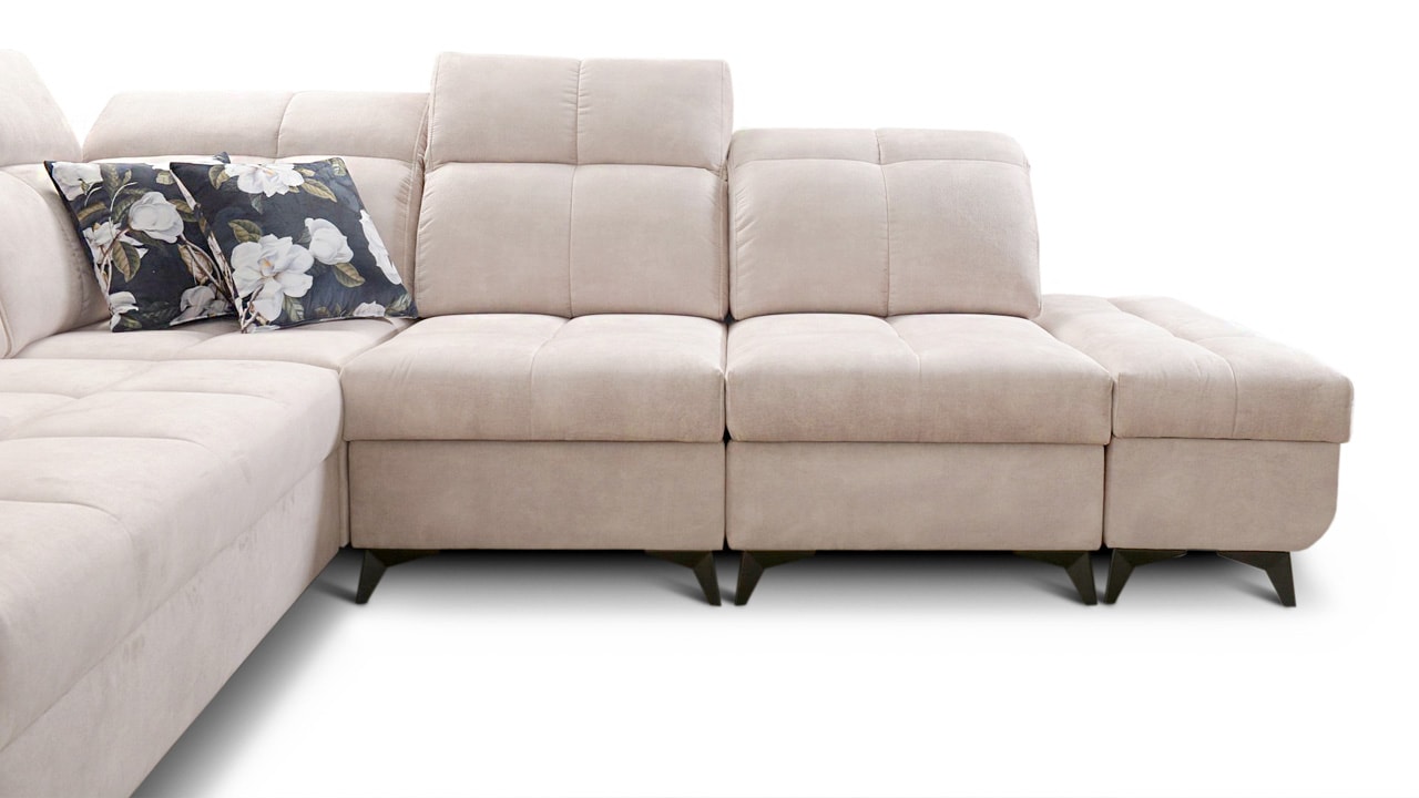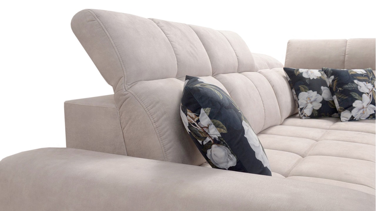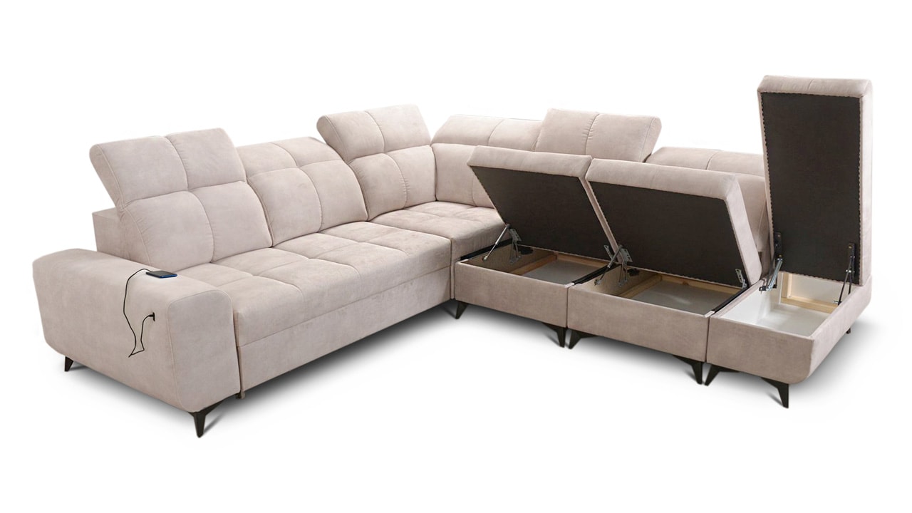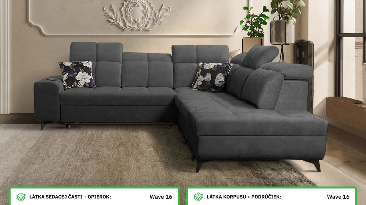 Táto rohová sedačka vo vašej obývačke zaručene vynikne. Navonok vyzerá veľmi elegantne a moderne, zároveň však bola stvorená pre váš relax. Ponúkne vám komfort aj inovácie. Výhodou je zabudovaná nabíjacia stanica, polohovateľné opierky hlavy, úložný priestor či možnosť rozkladania. Pozrite si vizualizácie a nechajte sa inšpirovať pri výbere poťahovej látky a dizajne detailov. Sedačku nie je možné vyrobiť v poťahoch Erie, Bristol a Bahama.