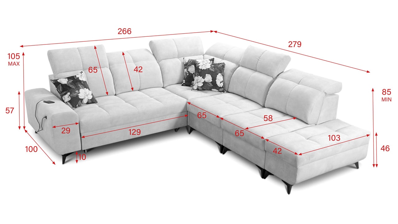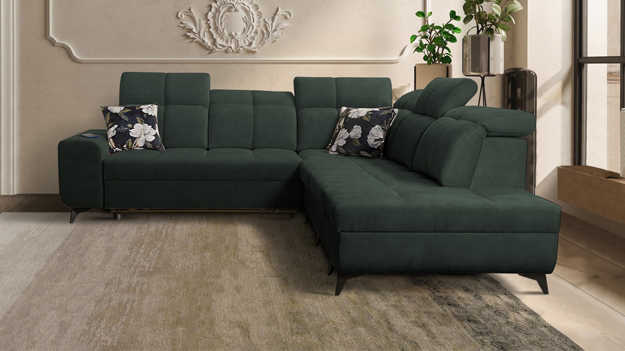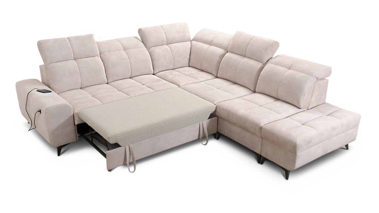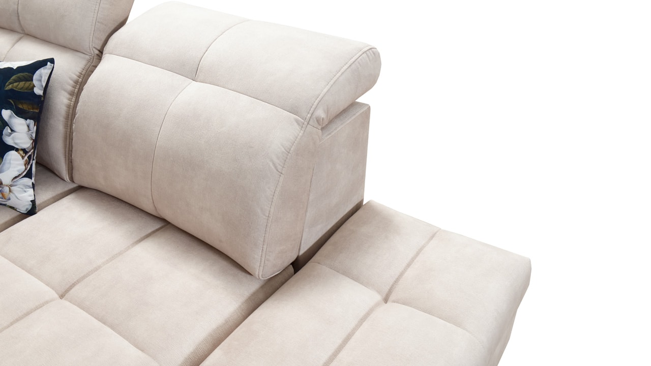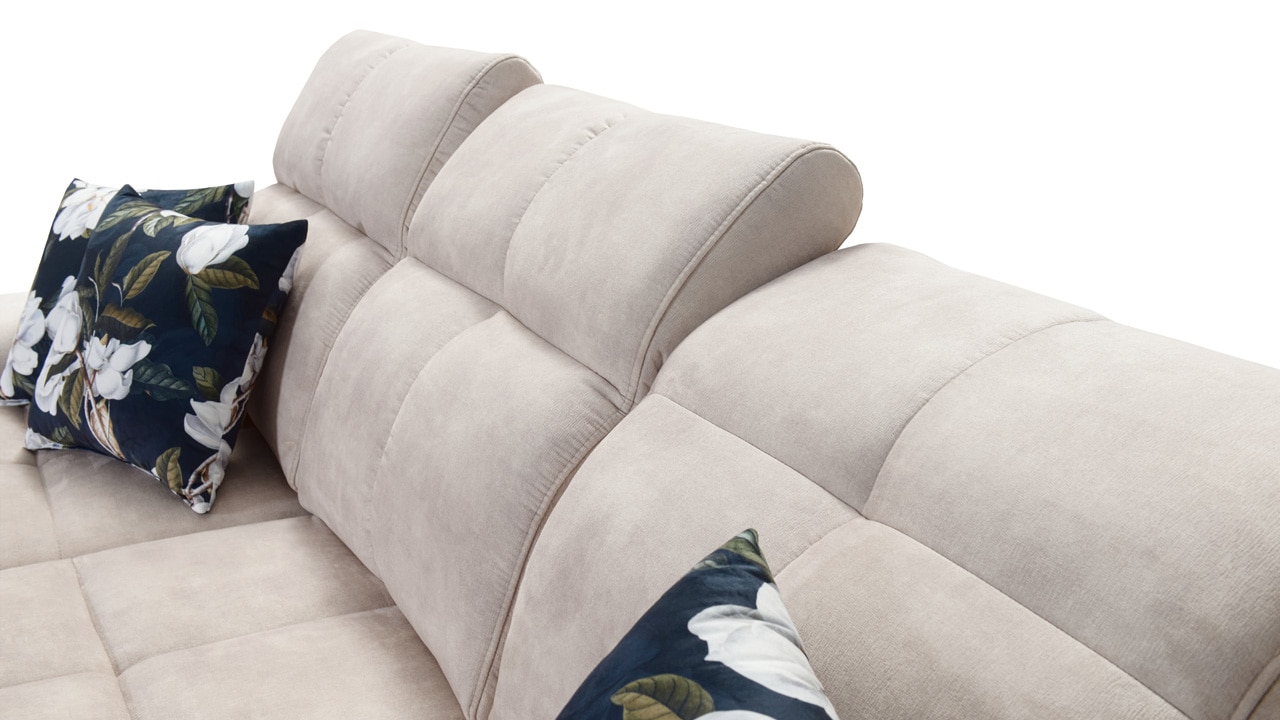 Táto rohová sedačka vo vašej obývačke zaručene vynikne. Navonok vyzerá veľmi elegantne a moderne, zároveň však bola stvorená pre váš relax. Ponúkne vám komfort aj inovácie. Výhodou je zabudovaná nabíjacia stanica, polohovateľné opierky hlavy, úložný priestor či možnosť rozkladania. Pozrite si vizualizácie a nechajte sa inšpirovať pri výbere poťahovej látky a dizajne detailov. Sedačku nie je možné vyrobiť v poťahoch Erie, Bristol a Bahama.