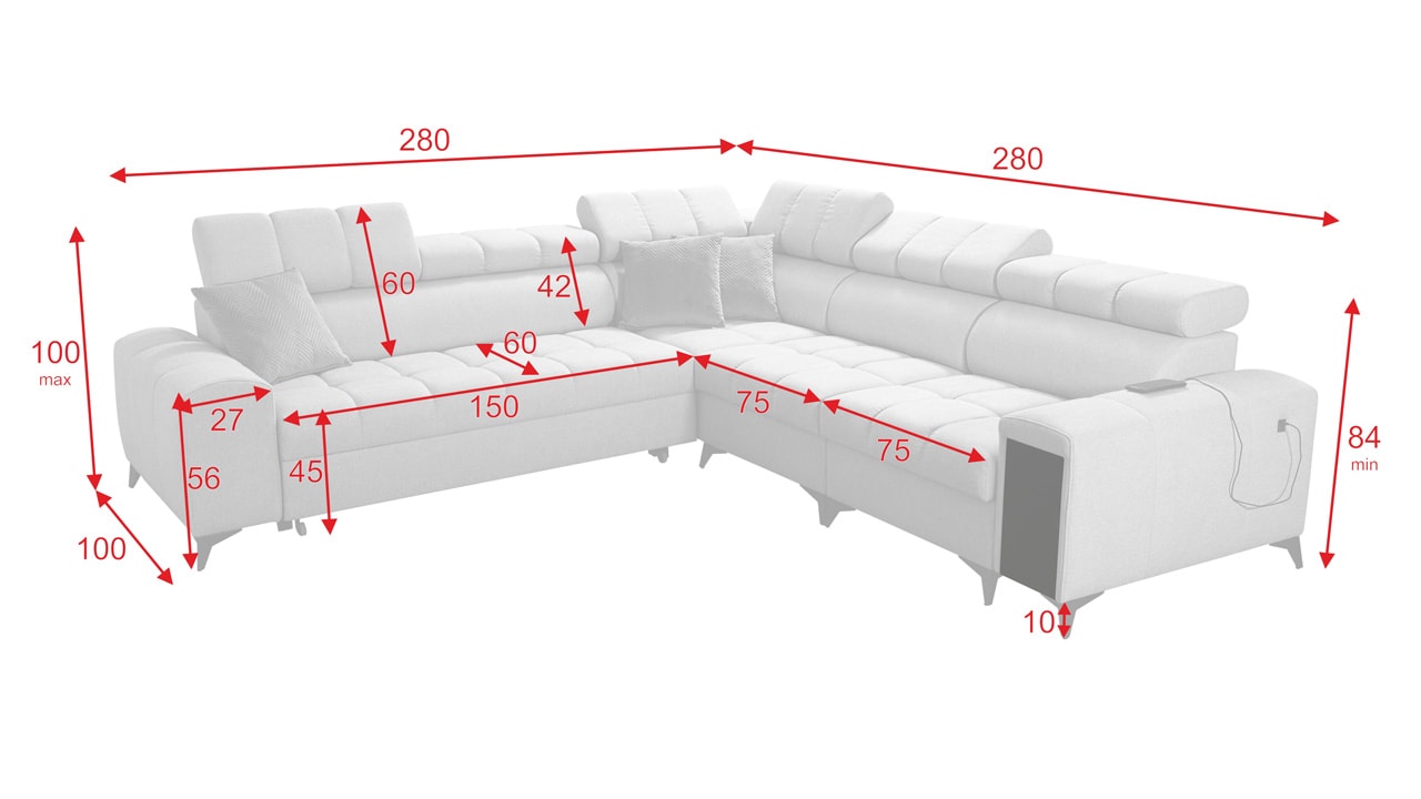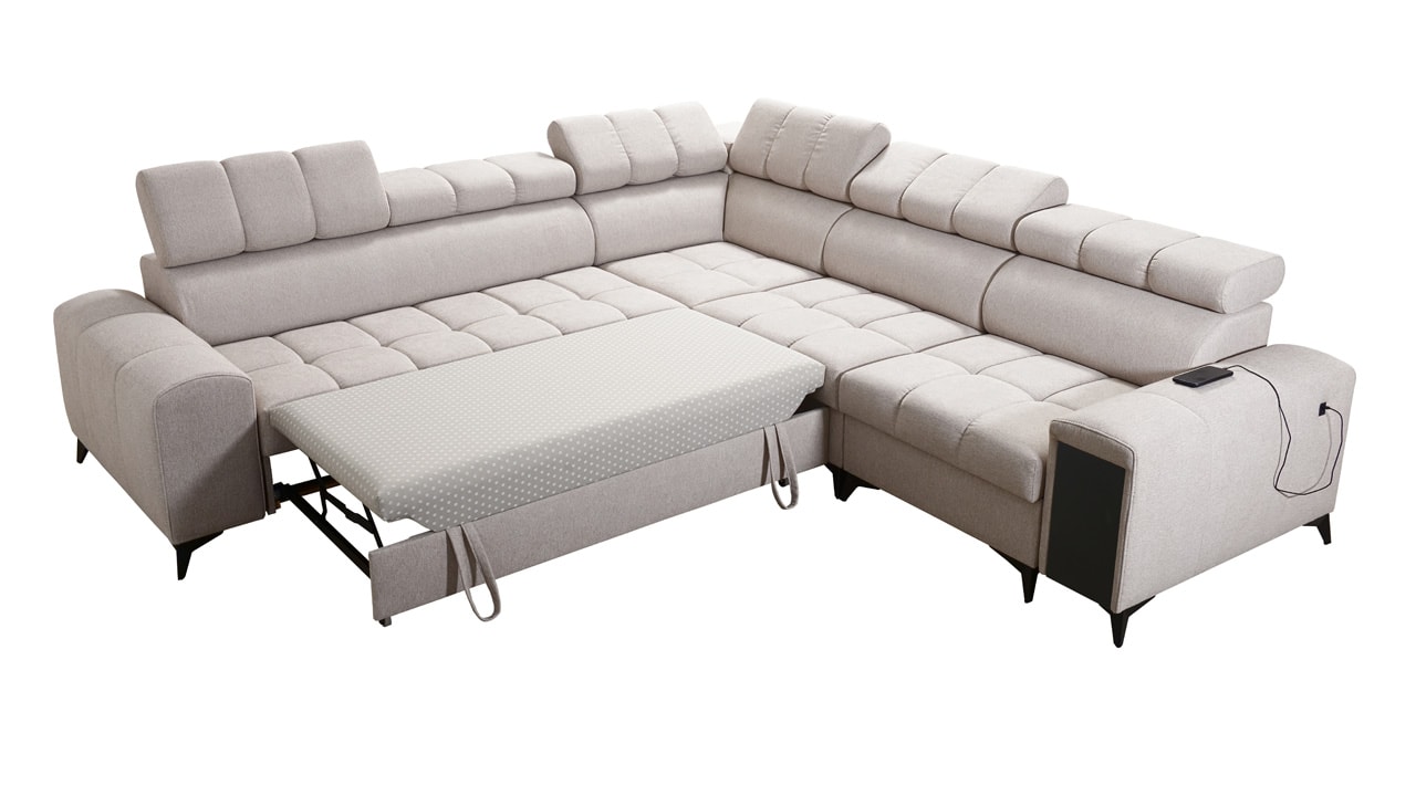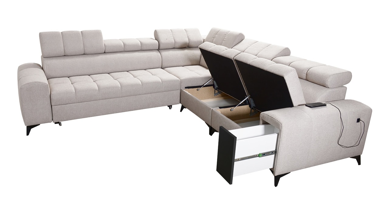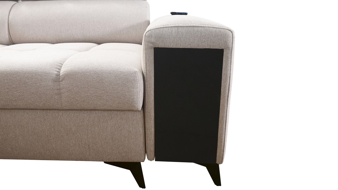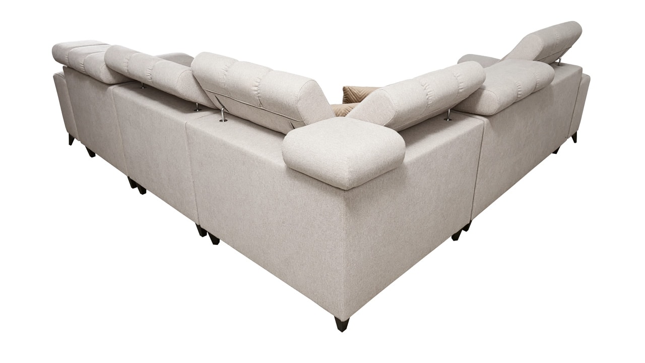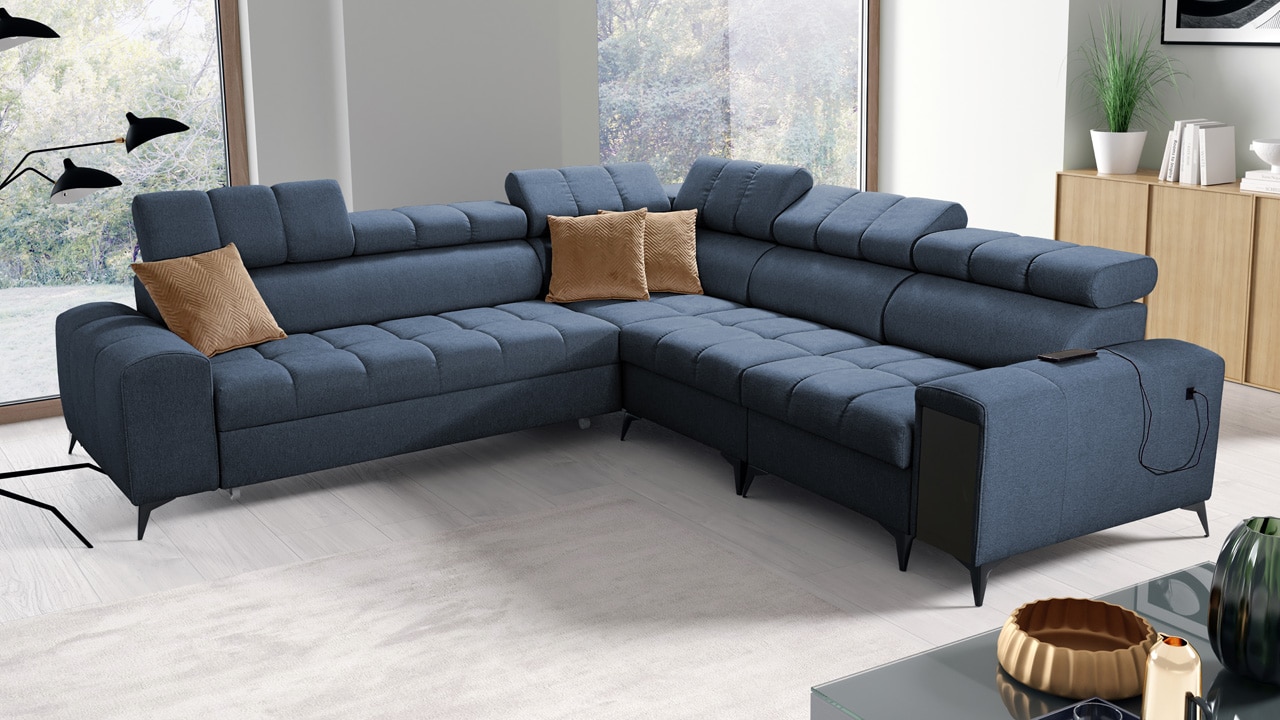 Moderná sedačka kombinujúca funkčnosť a elegantný dizajn. Z praktického hľadiska určite oceníte jej úložný priestor, USB port, vstavaný minibar a možnosť rozloženia. Pre vaše pohodlie budú slúžiť aj polohovateľné opierky hlavy. Z hľadiska dizajnu má sedačka moderné vysoké nožičky a zaujímavý dizajn šitia sedacej časti, ktorý jej dodáva šmrnc. Sedačku vám vyrobíme v poťahu podľa vášho vkusu (okrem materiálov Erie, Bristol a Bahama).