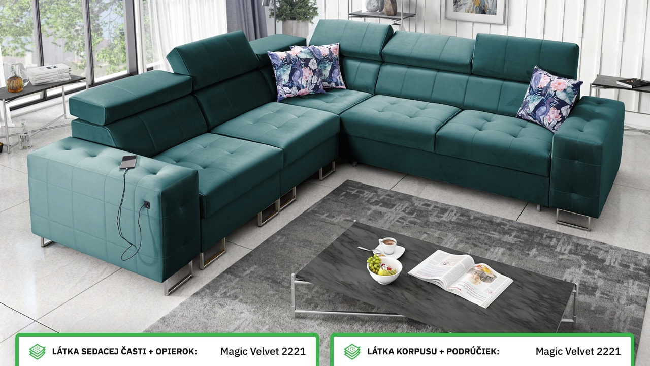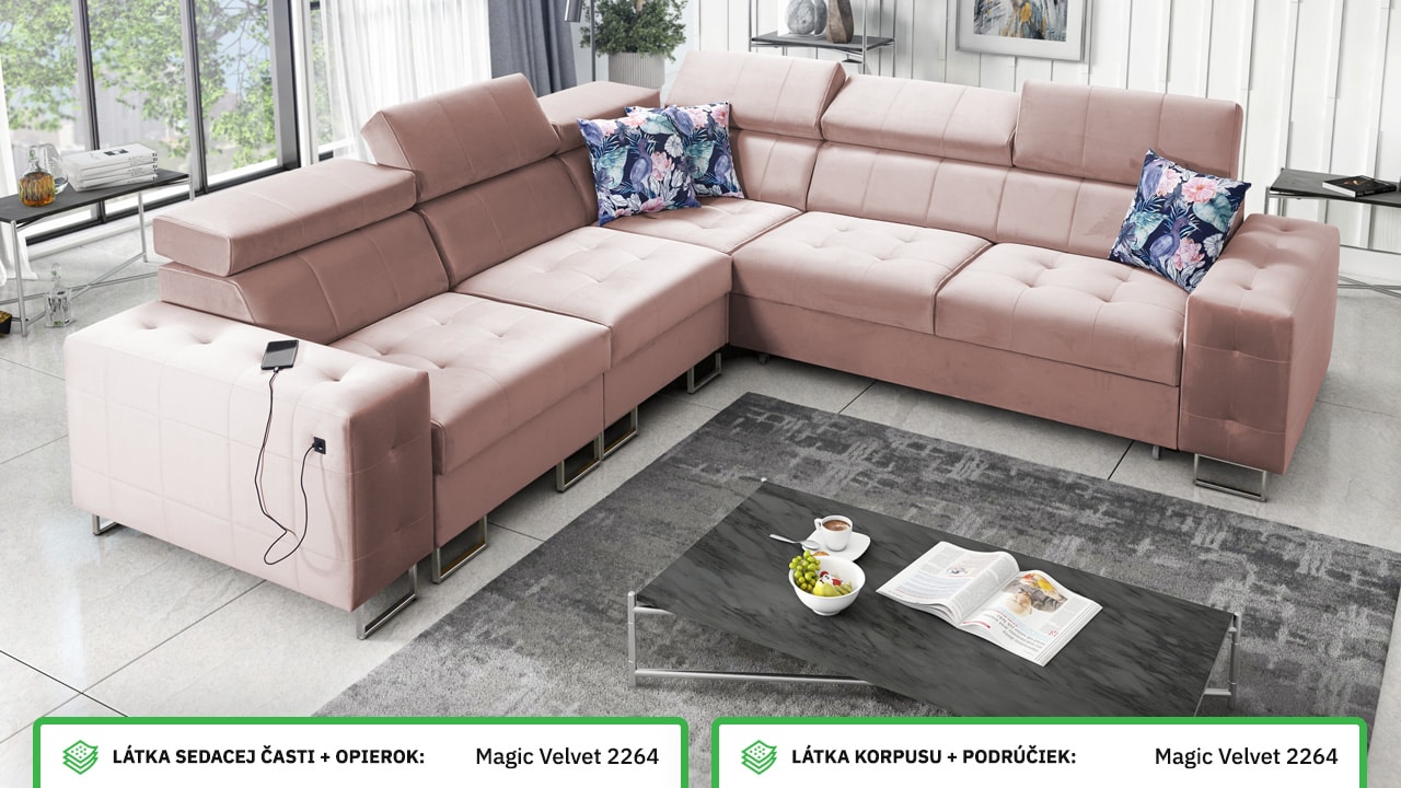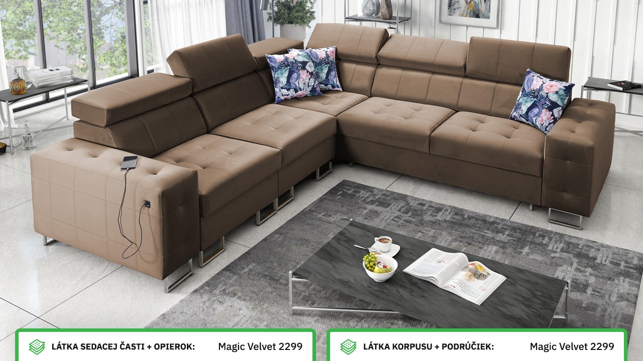 Rohová sedačka, ktorá spája štýl, pohodlie a praktickosť. Má elegantný, ale stále veľmi funkčný dizajn. Príjemne sa na nej sedí a je vybavená polohovateľnými opierkami hlavy. Jednoducho sa dá rozložiť na pohodlné dvojlôžko, čo oceníte pri návštevách. Okrem toho udrží vašu obývačku upratanú a usporiadanú vďaka integrovanému úložnému priestoru. Nechajte si ju vyrobiť vo farbe podľa seba a užite si na nej príjemný relax.