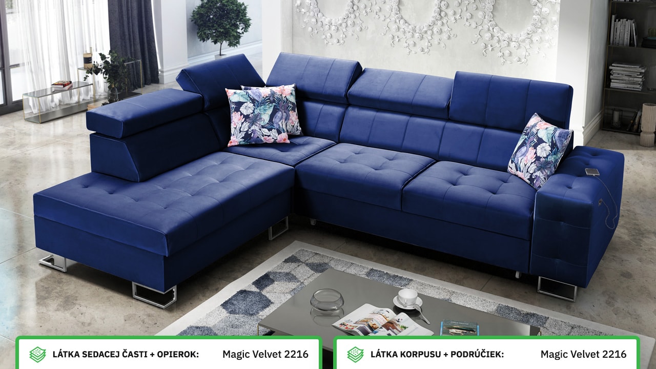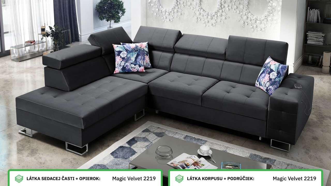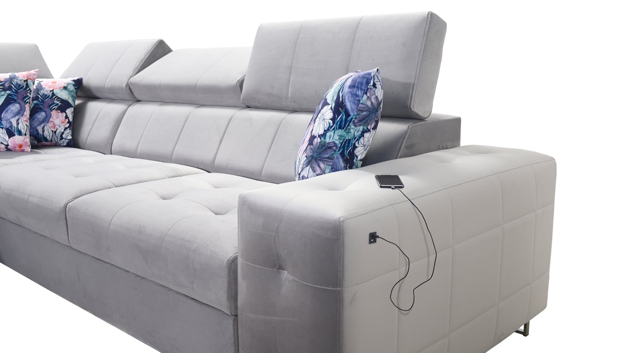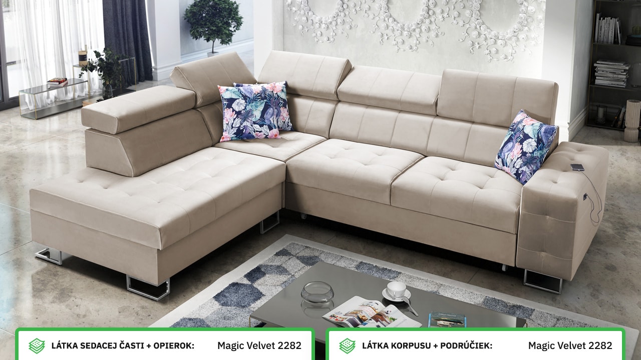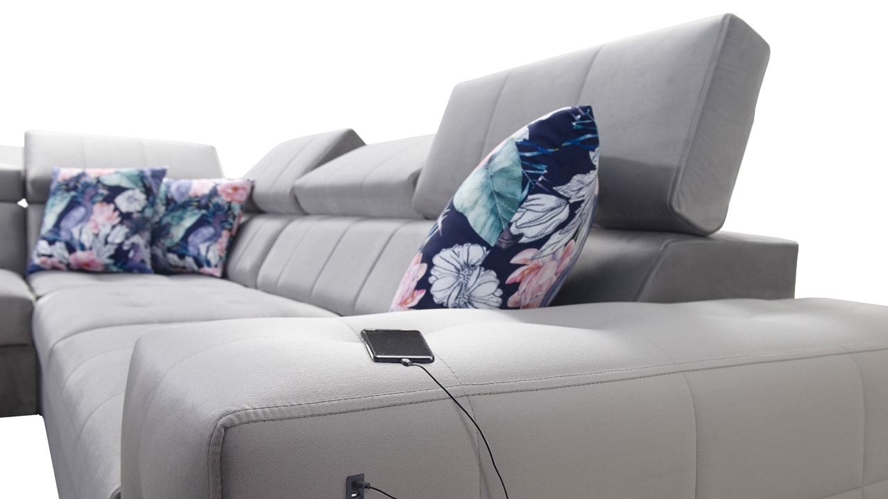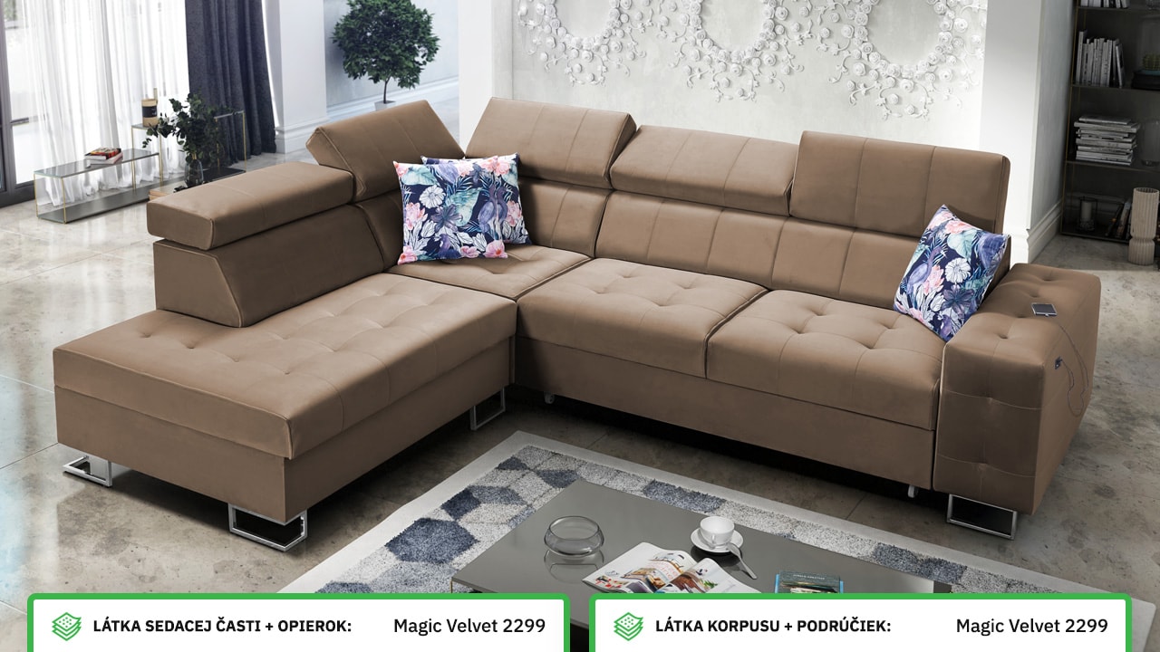 Moderná rohová sedačka, ktorá vám poskytne flexibilitu a komfort. Podľa svojich predstáv si totiž môžete zvoliť nie len farbu a typ poťahovej látky, ale aj dizajn nožičiek a orientáciu rohu na pravú či ľavú stranu. No a čo ten komfort? Ten zabezpečí kvalitná výplň sedenia, pohodlné opierky chrbtice, nastaviteľné opierky hlavy, možnosť rozloženia a vstavaný USB port na nabíjanie, vďaka ktorému budete mať mobil či tablet hneď po ruke.