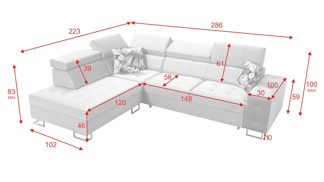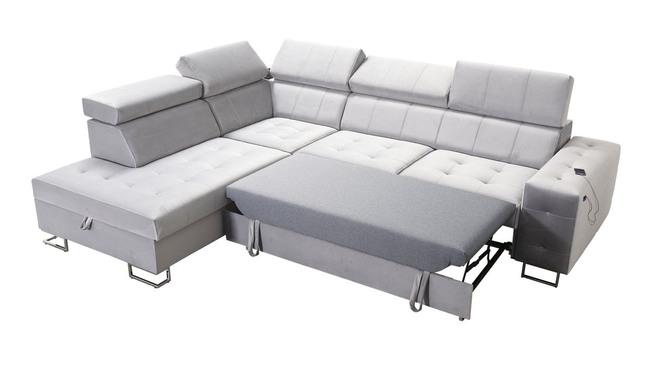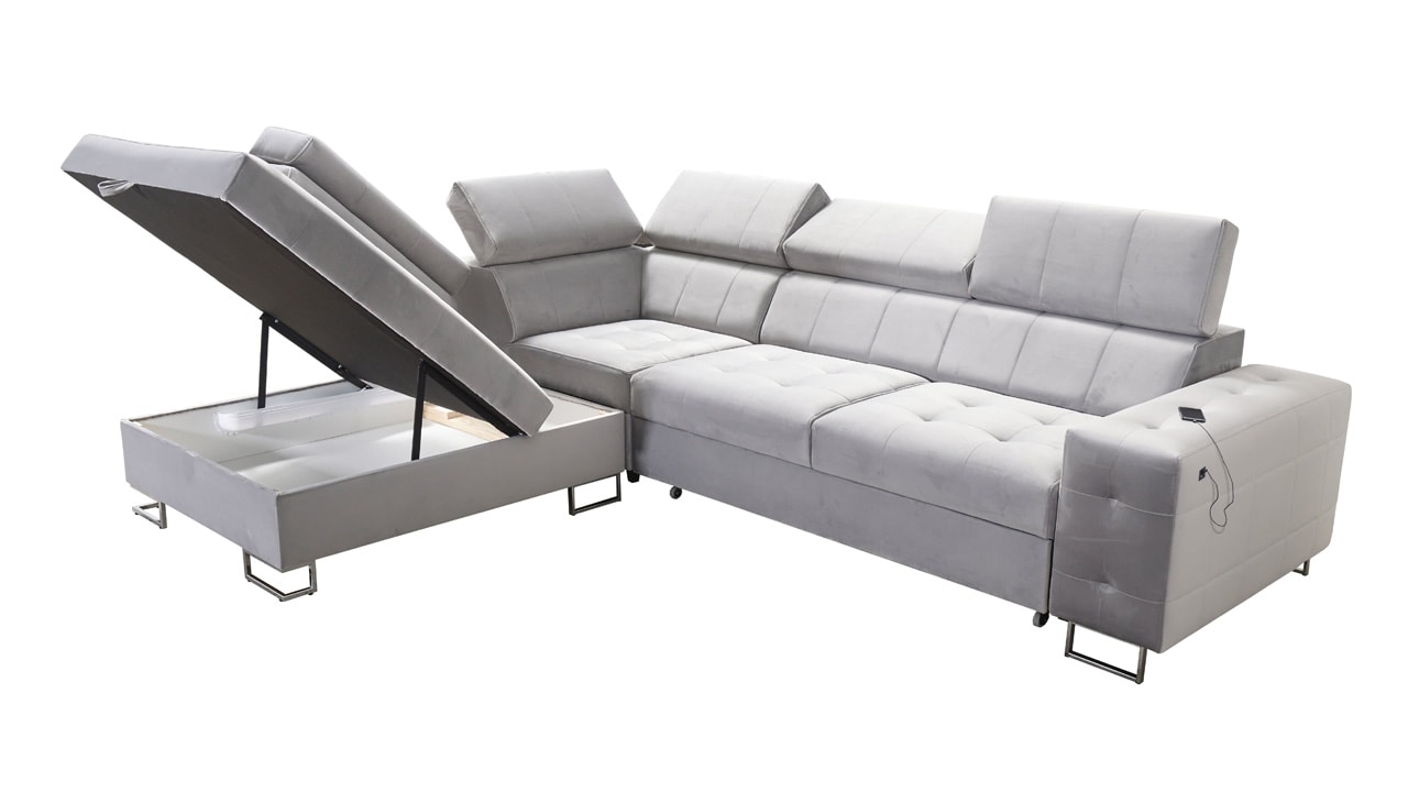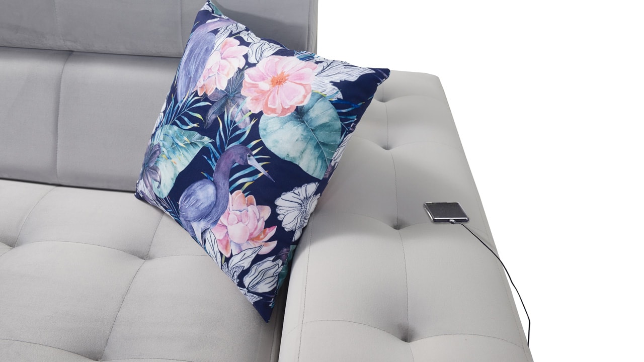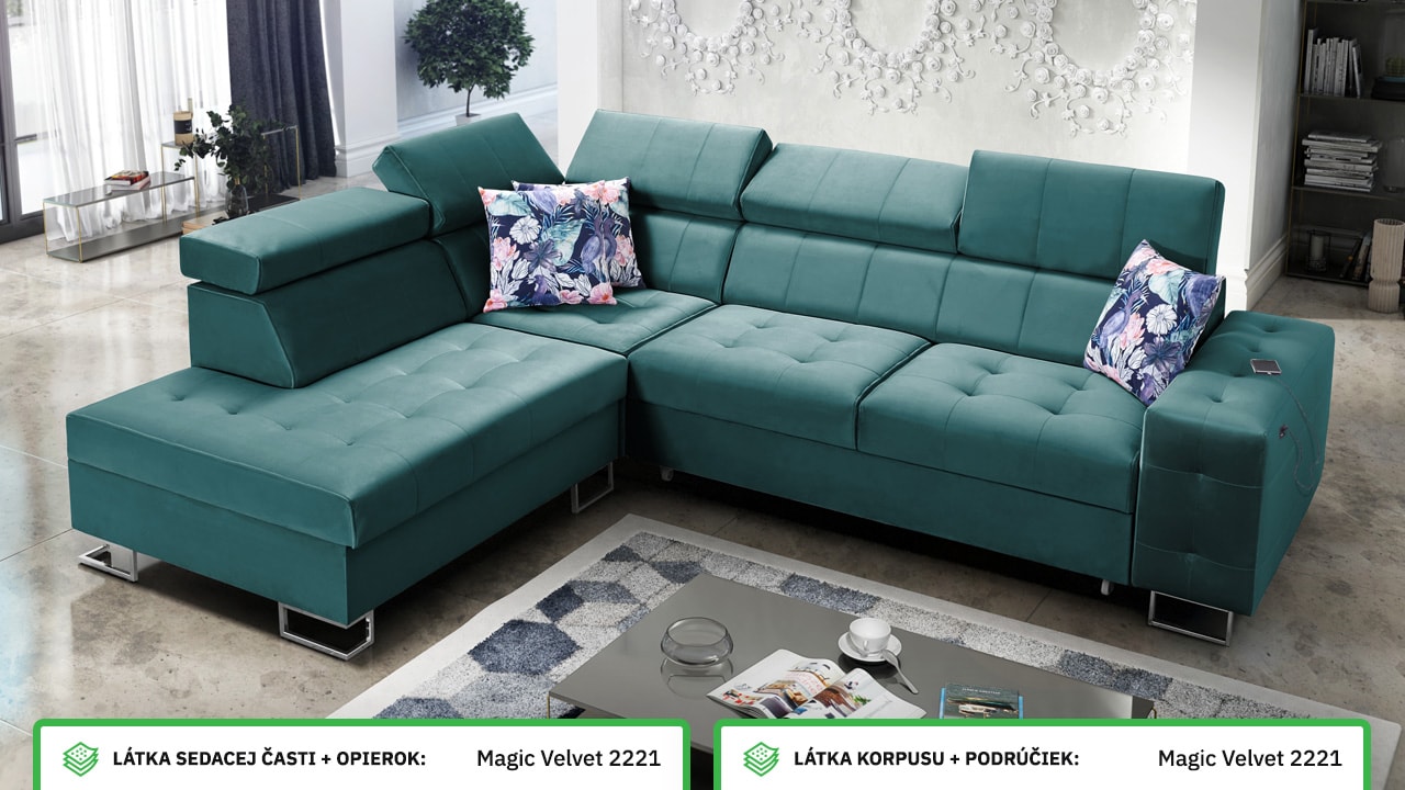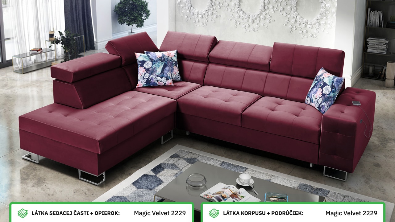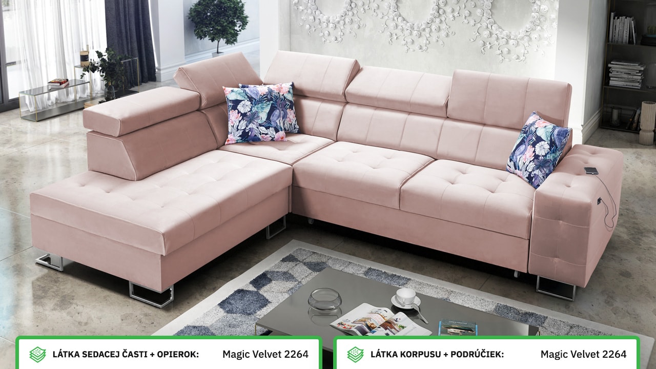 Moderná rohová sedačka, ktorá vám poskytne flexibilitu a komfort. Podľa svojich predstáv si totiž môžete zvoliť nie len farbu a typ poťahovej látky, ale aj dizajn nožičiek a orientáciu rohu na pravú či ľavú stranu. No a čo ten komfort? Ten zabezpečí kvalitná výplň sedenia, pohodlné opierky chrbtice, nastaviteľné opierky hlavy, možnosť rozloženia a vstavaný USB port na nabíjanie, vďaka ktorému budete mať mobil či tablet hneď po ruke.
