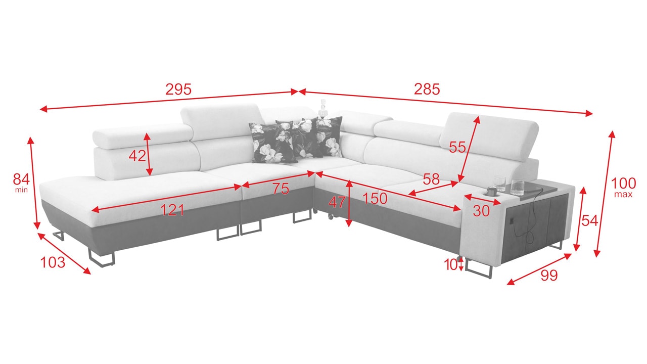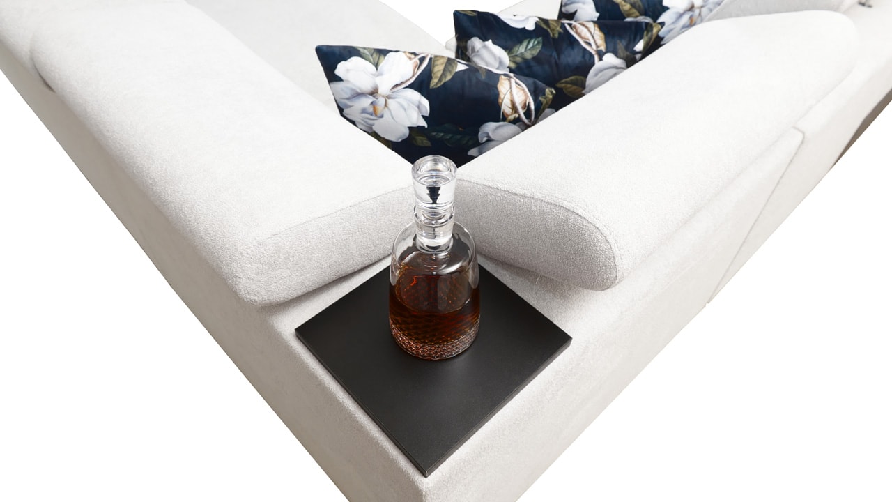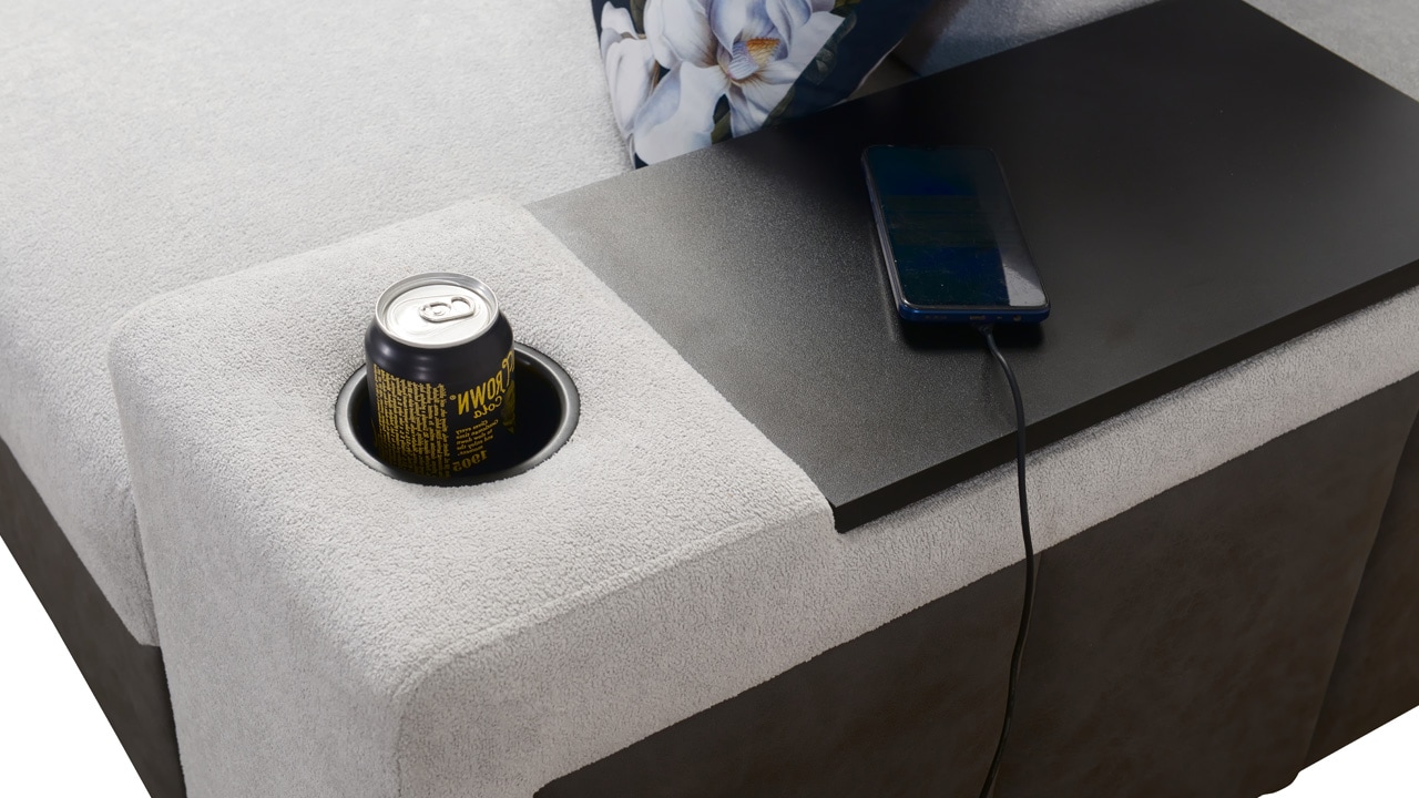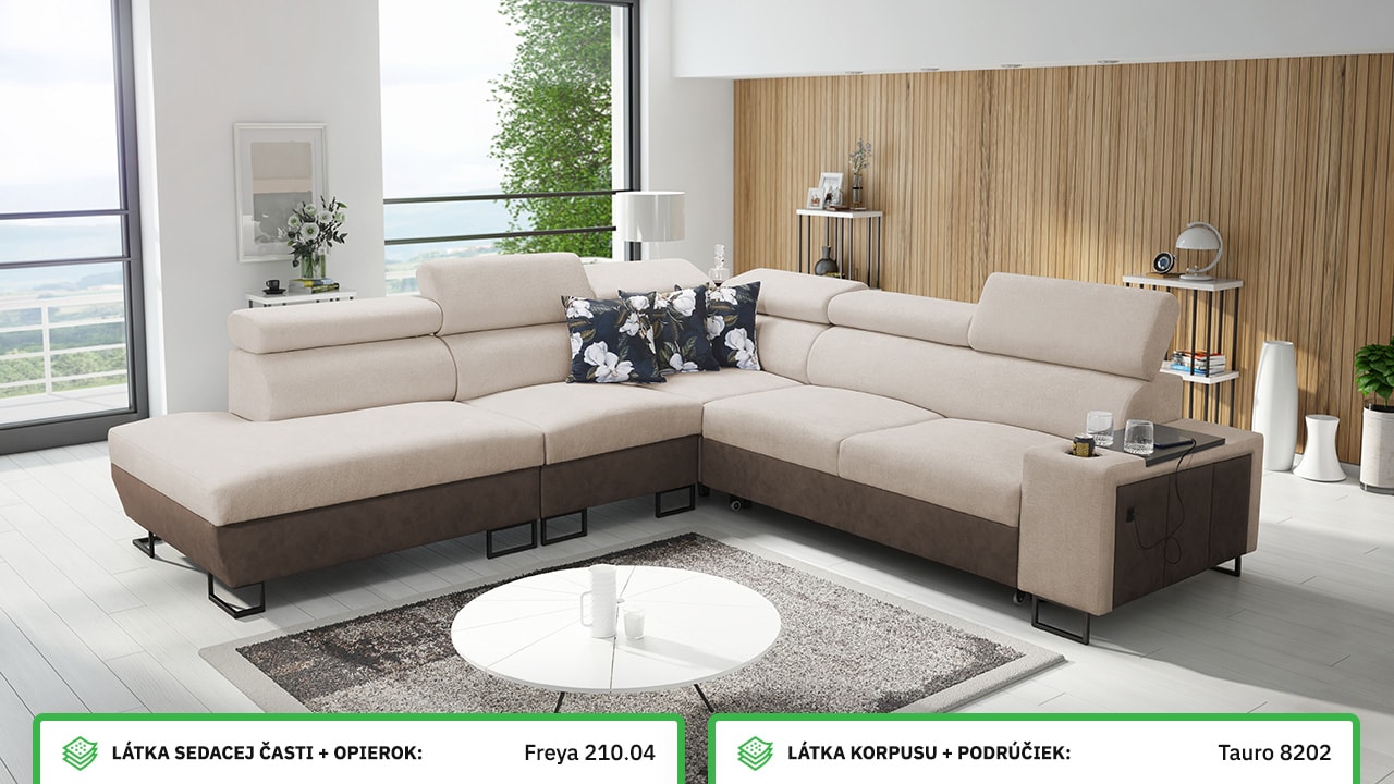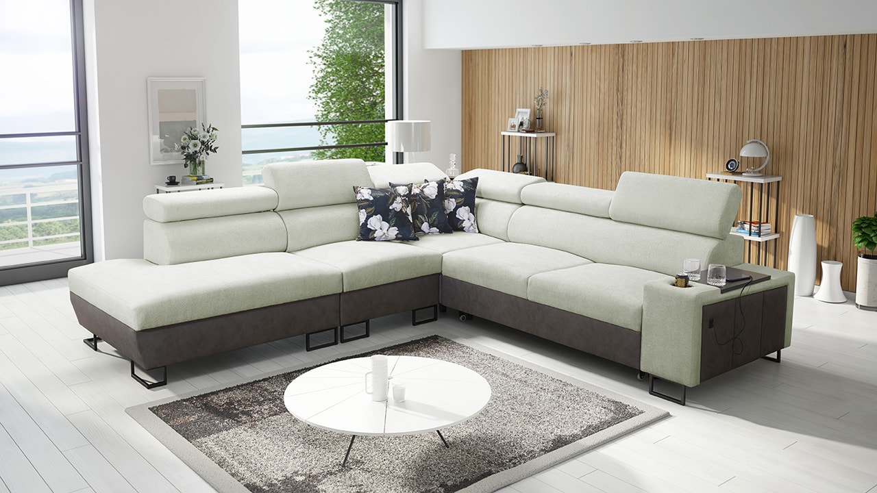 Veľká rohová sedačka pre vaše moderné bývanie. Je vybavená všetkým, čo by ste od sedačky mohli očakávať – dá sa rozložiť, ukrýva veľký úložný priestor, má nastaviteľné opierky hlavy, vstavaný minibar, držiak na pohár, a tiež zabudovanú USB nabíjačku pre nabitie mobilu alebo tabletu. Okrem toho je extra pohodlná, vďaka čomu sa stane dokonalým spoločníkom na dlhé večery pri filme či dobrej knihe.