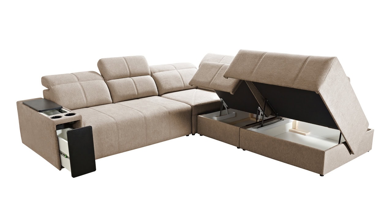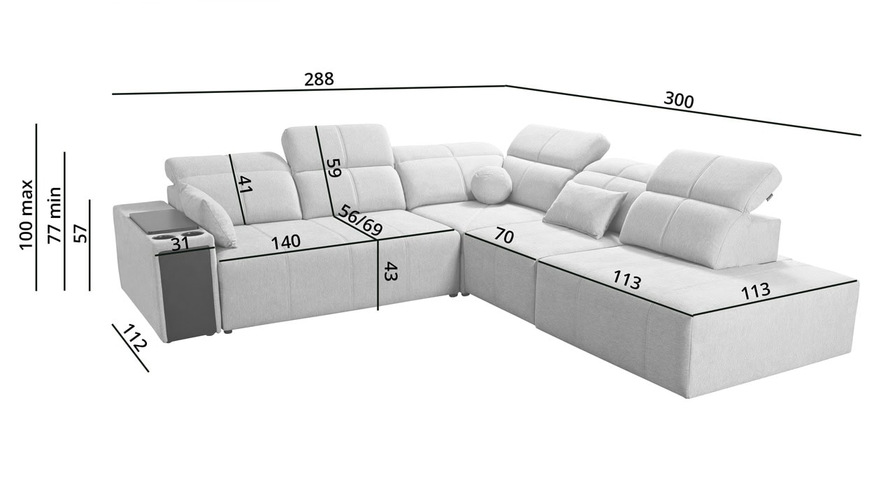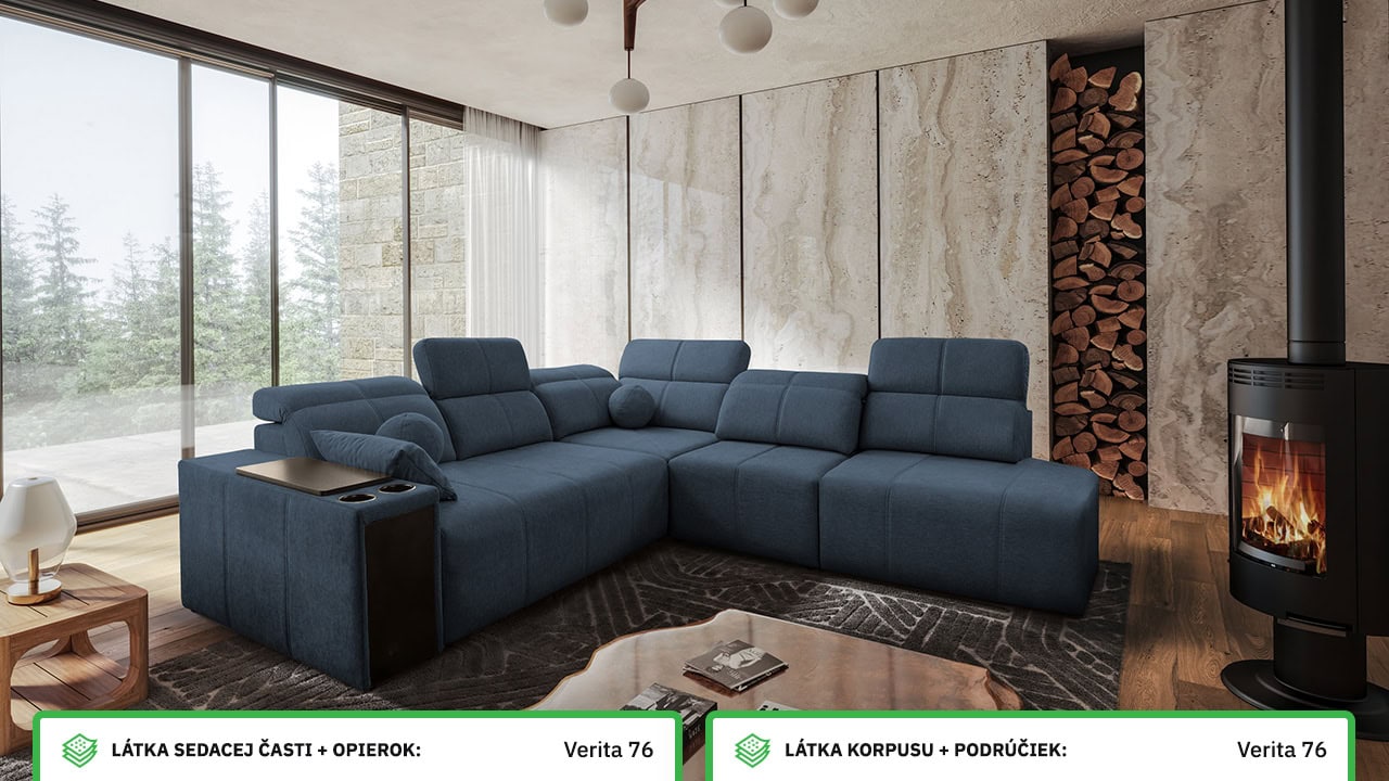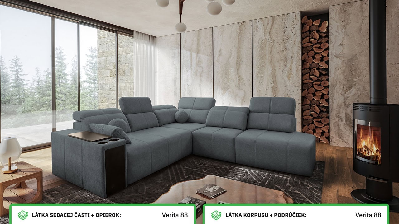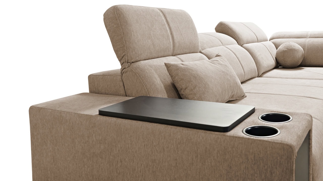 Rohová sedačka s jemnými líniami a kvalitným poťahom vám prinesie maximálny komfort. Ponúka štedrý priestor na sedenie. Polohovateľné opierky hlavy vám umožnia nastaviť si ideálnu pozíciu tela a čerešničku tomu celému dá posuvná chrbtová opierka. Usaďte sa, umiestnite do držiaka váš obľúbený nápoj, vytiahnite pochutiny z minibaru a ponorte sa do obľúbeného filmu, knihy či inej formy relaxu. Sedačka je vybavená aj vstavanou zásuvkou a nabíjacou stanicou pre vaše smart zariadenie.