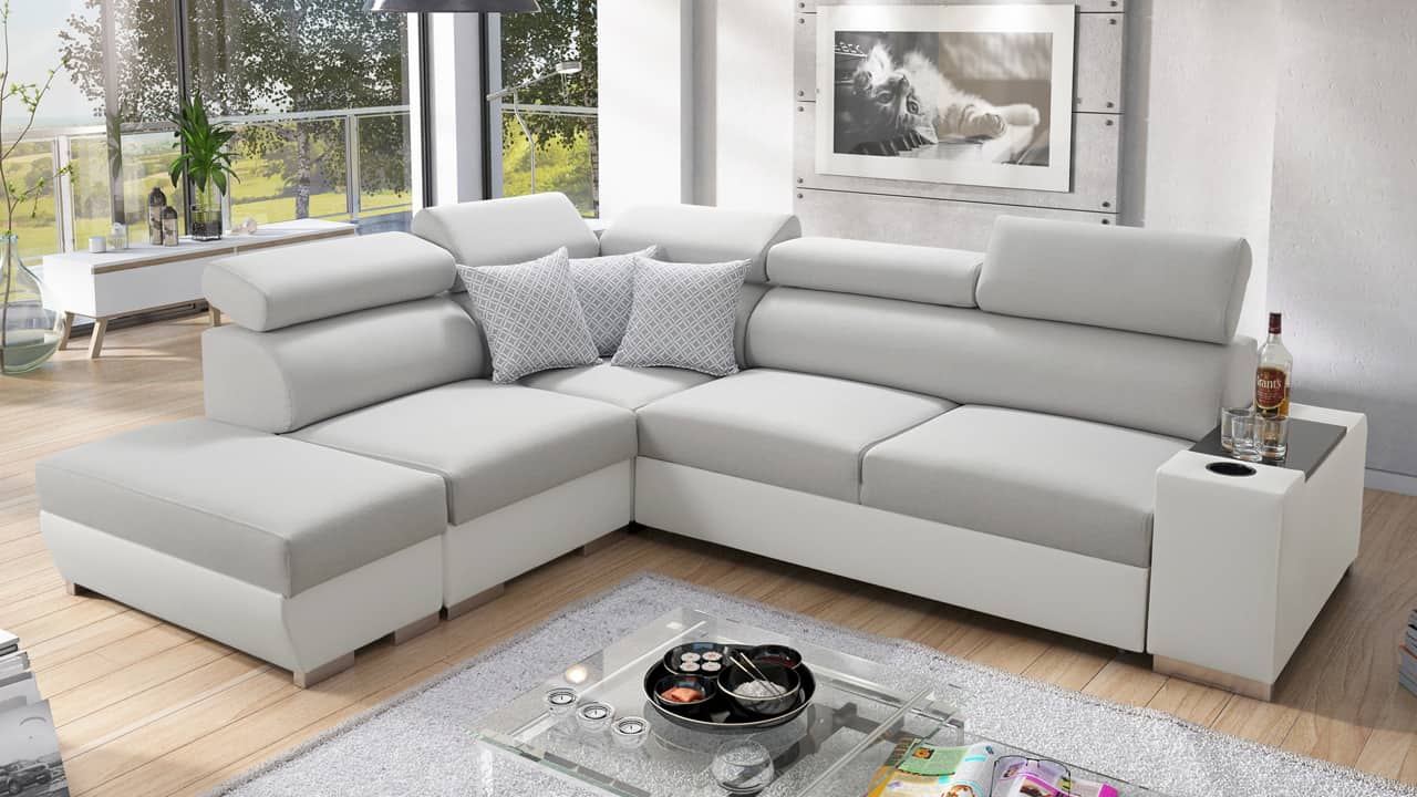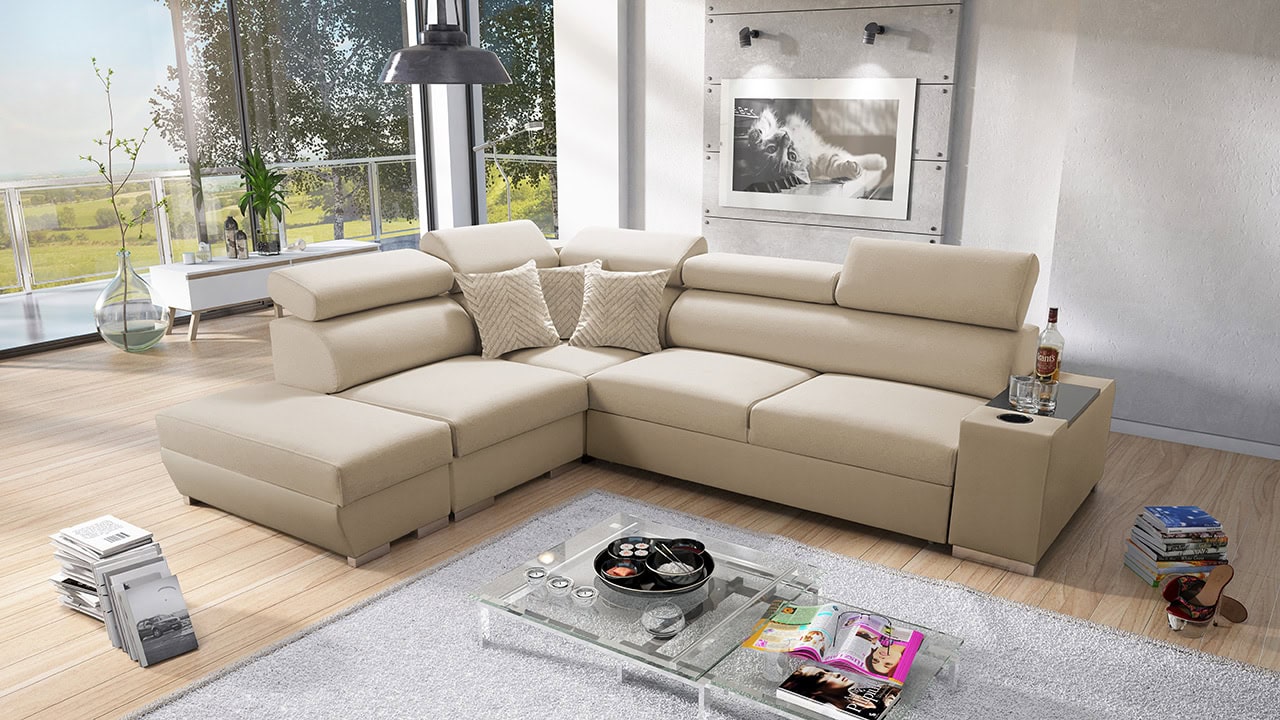 Táto priestranná rohová sedačka splní želania aj tým najnáročnejším. Pohovka má totiž v bočnej opierke zabudovaný mini bar spolu s podstavcom na pohár. Okrem toho disponuje nastaviteľnými opierkami hlavy a možnosťou rozloženia.