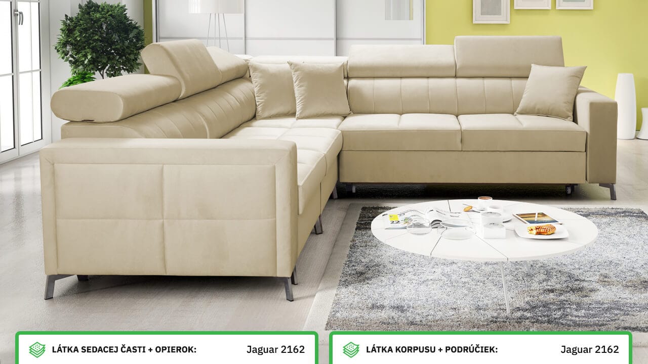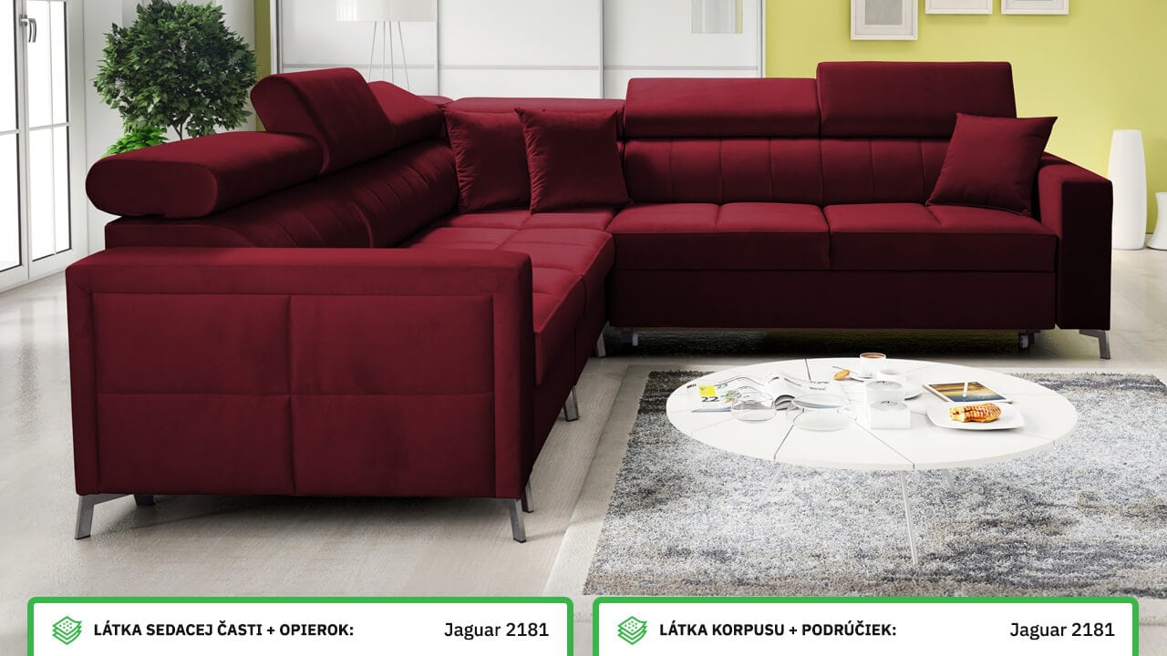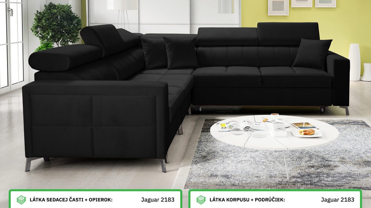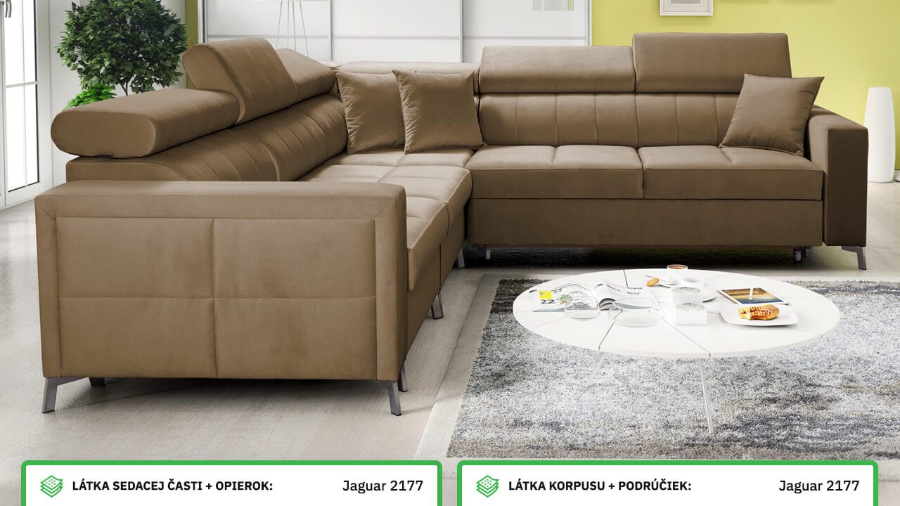 Moderná, pohodlná a kvalitná rohová sedačka, ktorá sa vďaka svojim rozmerom hodí aj do menších panelákových bytov. Má vstavané polohovateľné opierky hlavy, úložný priestor aj možnosť rozloženia. Výhodou tiež je, že typ a farbu poťahovej látky si na sedačku môžete nakombinovať podľa seba. Ľahko ju tak zladíte aj so starším nábytkom. Prezrite si vizualizácie a nechajte sa inšpirovať našimi návrhmi farebných prevedení.