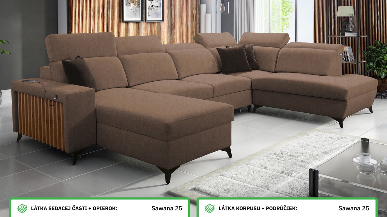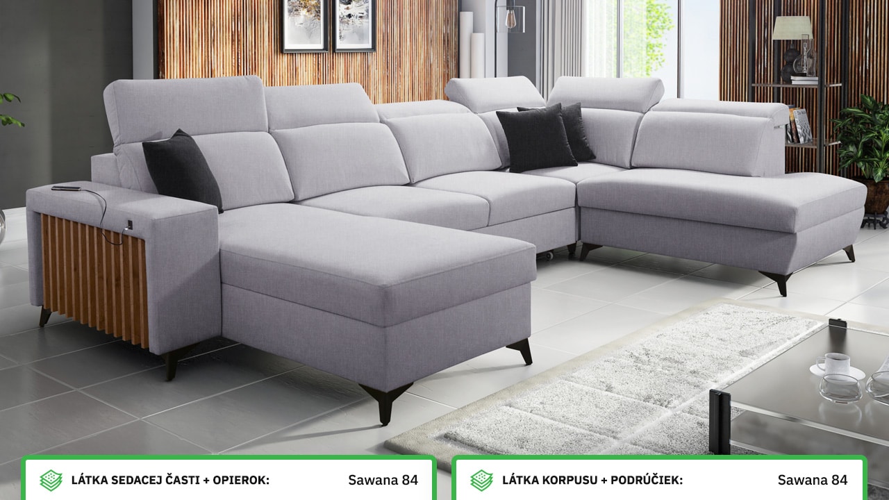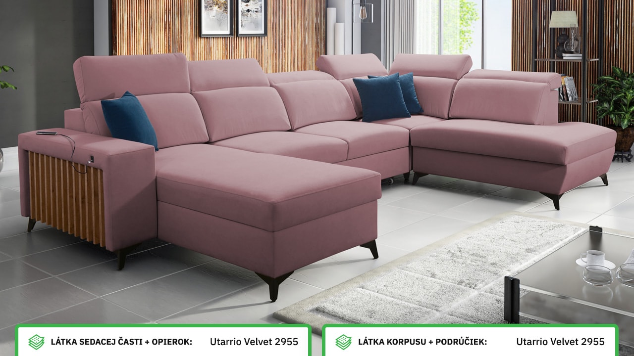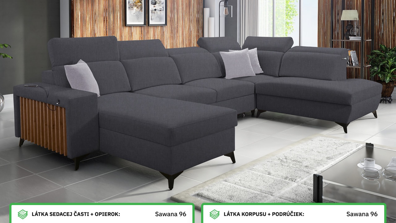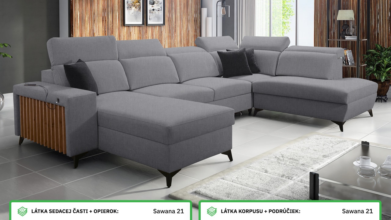 Neviete nájsť tú správnu sedaciu súpravu? Túžite po výraznej žiarivej farbe, alebo naopak po jemných zemitých odtieňoch? Túto sedačku si môžete nechať vyrobiť na mieru v akomkoľvek poťahu z nášho vzorkovníka. Dolaďte si k nej ešte zaujímavý dizajnový drevený prvok a potom si už len sadnite a zrelaxujte. Pomôže vám v tom pohodlné sedenie, polohovateľné opierky hlavy aj vstavané USB porty na nabitie mobilu či tabletu.