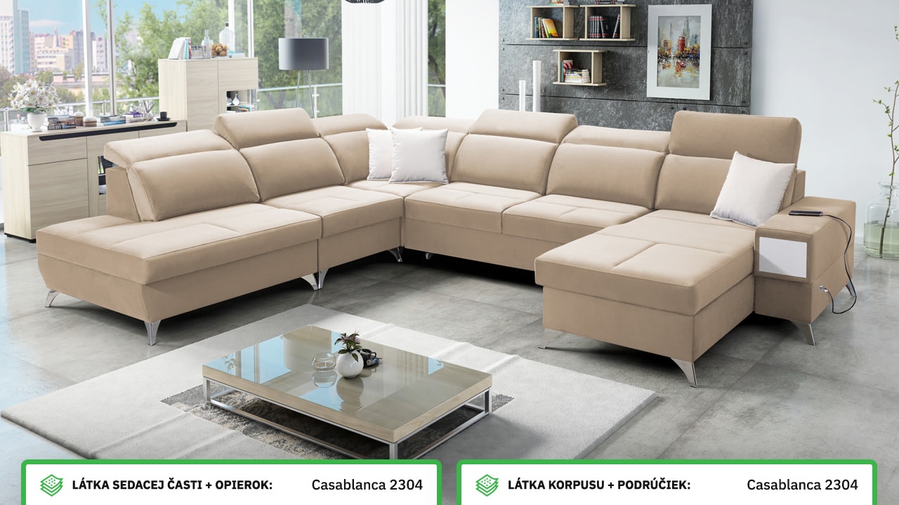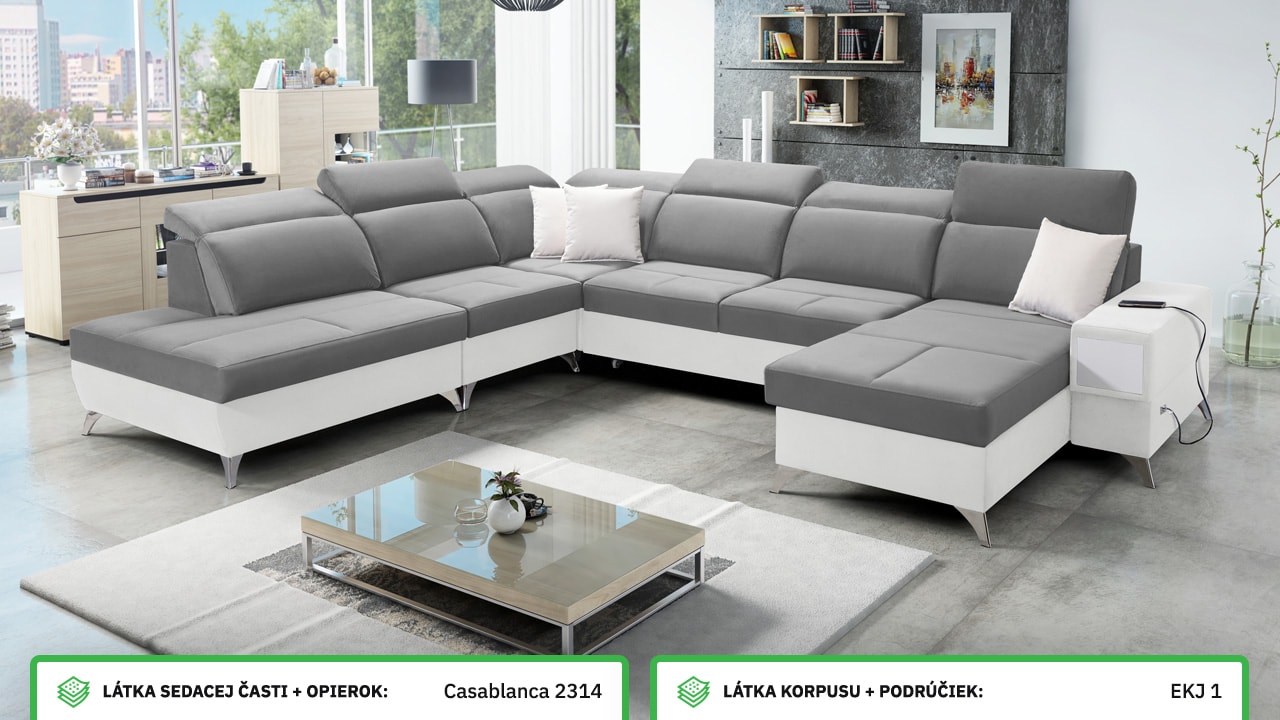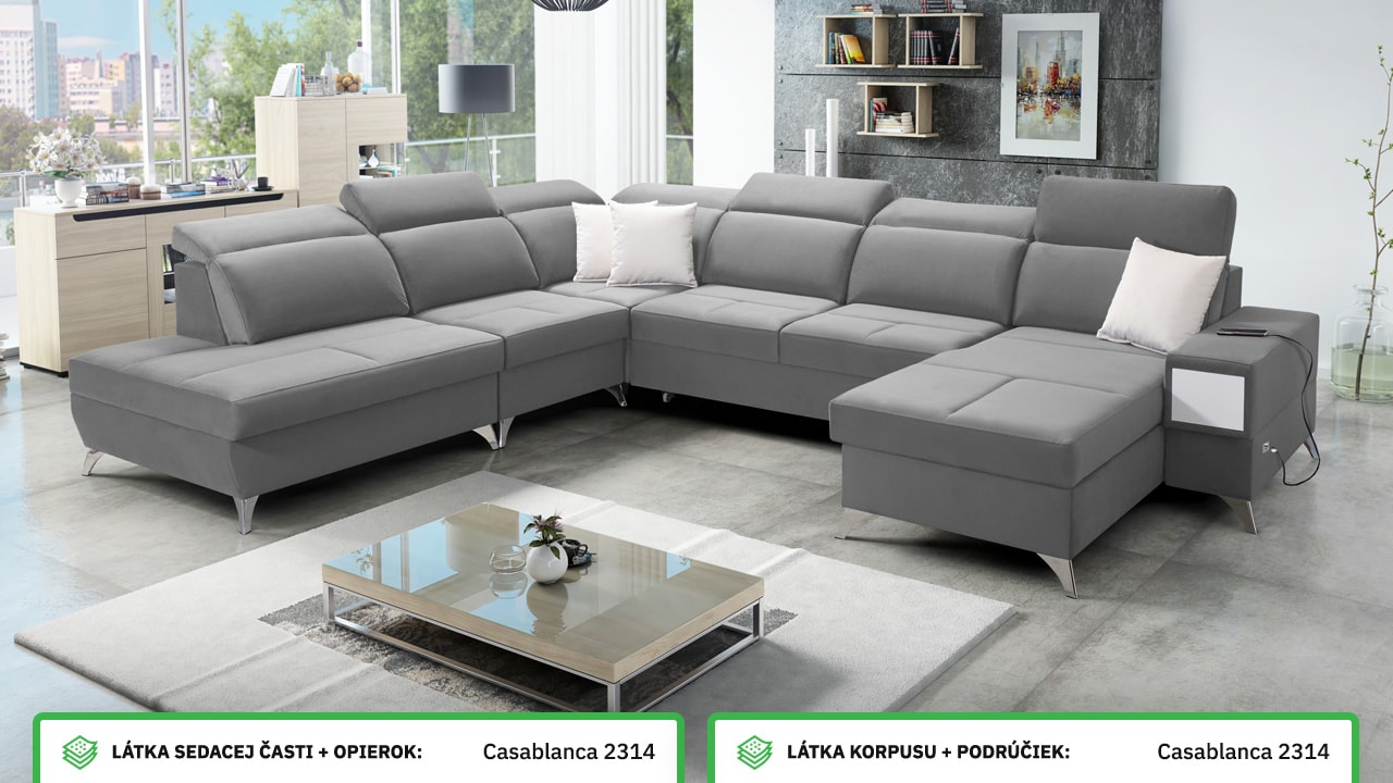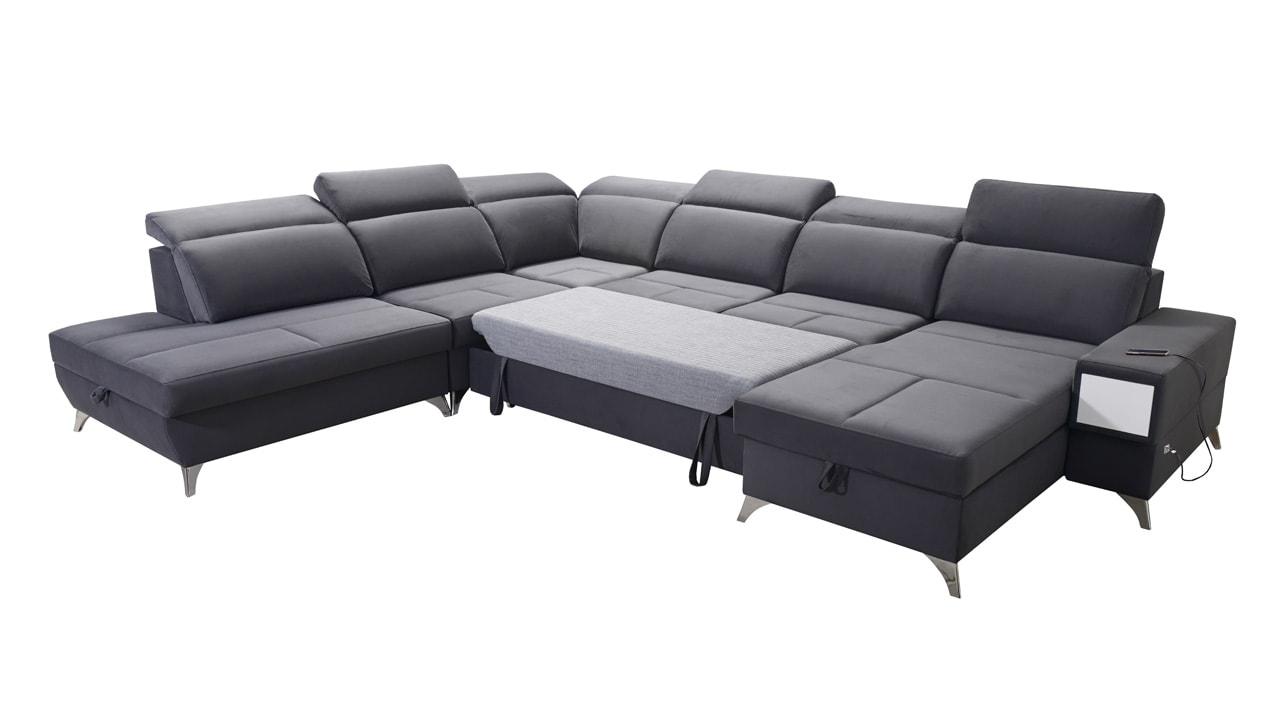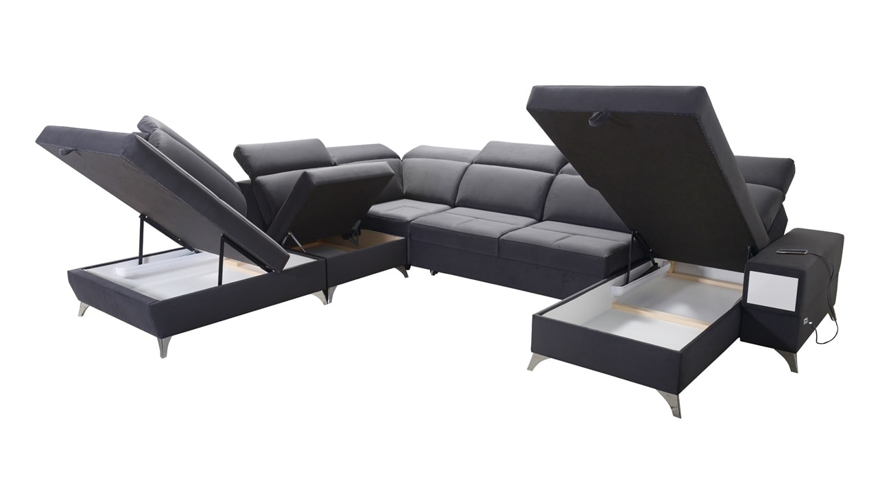 Táto veľmi veľká a priestranná sedacia súprava do tvaru U pohodlne usadí celú vašu rodinu. Je vhodná do viacčlennej domácnosti, kde si na nej všetci spolu oddýchnu a poleňošia. Má nastaviteľné opierky hlavy, USB porty na nabíjanie, vstavaný šuplík v bočnej opierke a úložný priestor rozdelený až do troch častí. Po rozložení poskytne naozaj veľkú spaciu plochu. Typ nožičiek, farbu poťahovej látky aj dizajn šuplíku si môžete nakonfigurovať sami podľa svojich predstáv.