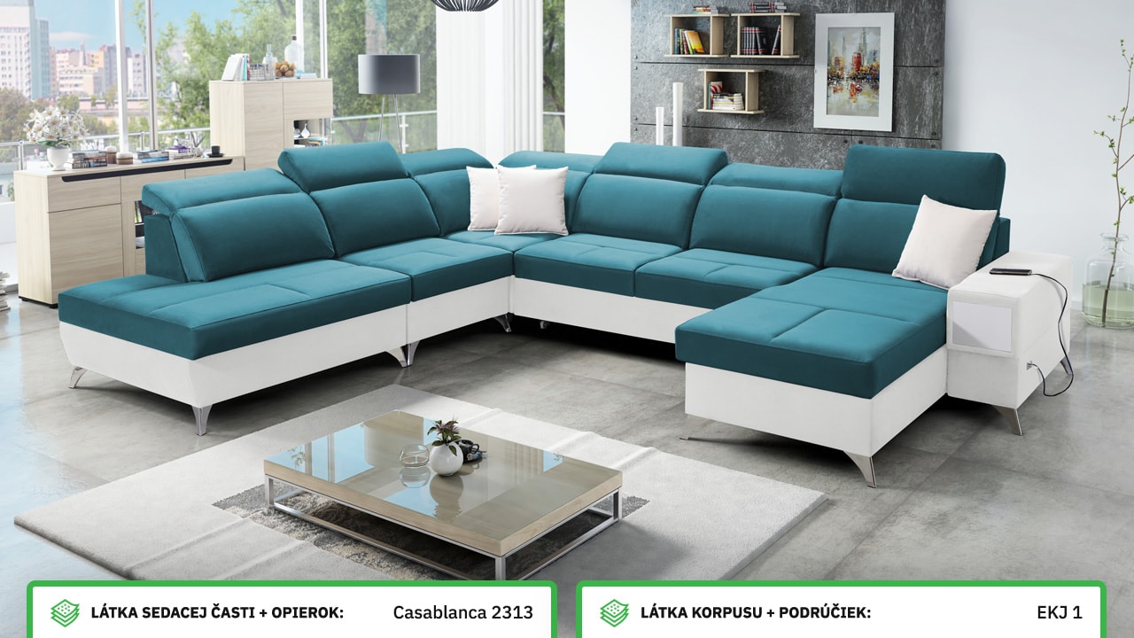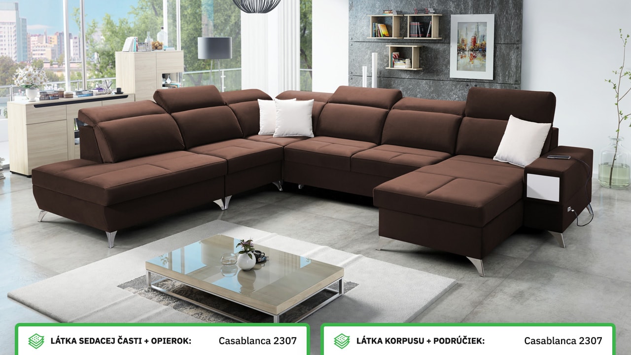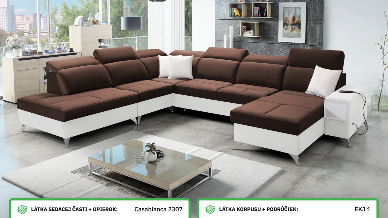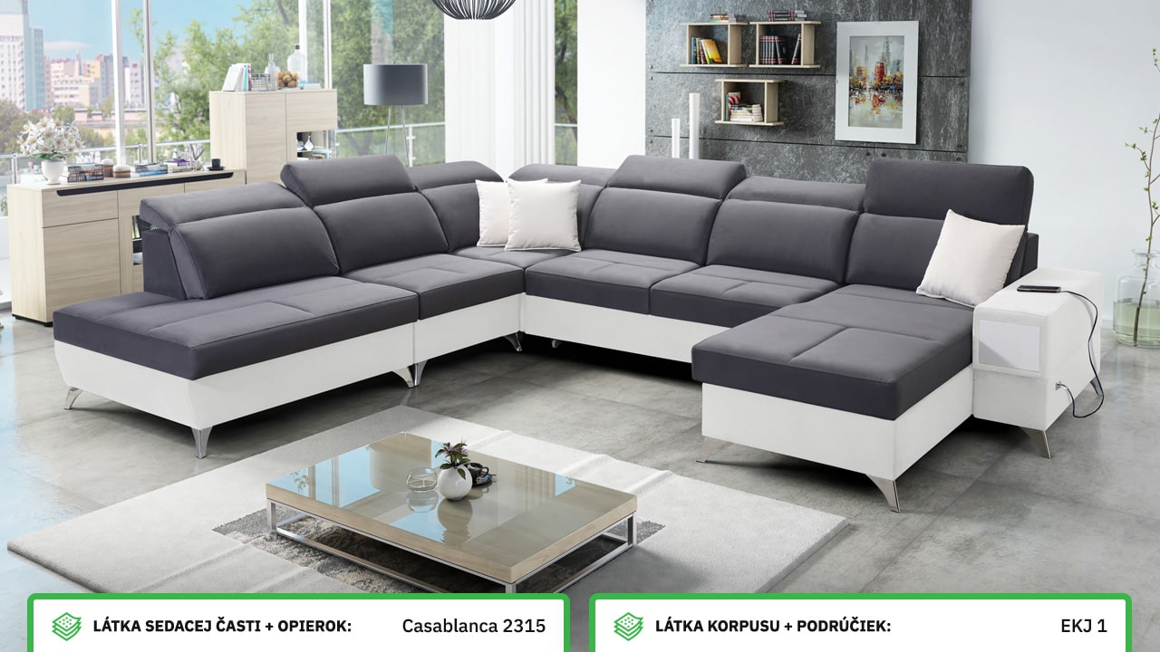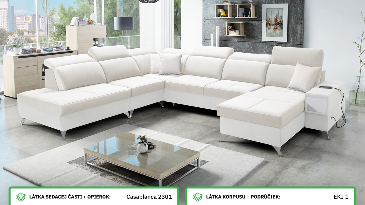 Táto veľmi veľká a priestranná sedacia súprava do tvaru U pohodlne usadí celú vašu rodinu. Je vhodná do viacčlennej domácnosti, kde si na nej všetci spolu oddýchnu a poleňošia. Má nastaviteľné opierky hlavy, USB porty na nabíjanie, vstavaný šuplík v bočnej opierke a úložný priestor rozdelený až do troch častí. Po rozložení poskytne naozaj veľkú spaciu plochu. Typ nožičiek, farbu poťahovej látky aj dizajn šuplíku si môžete nakonfigurovať sami podľa svojich predstáv.
