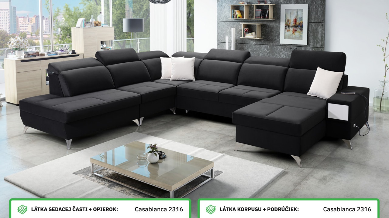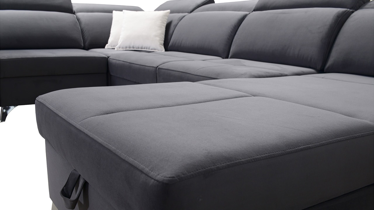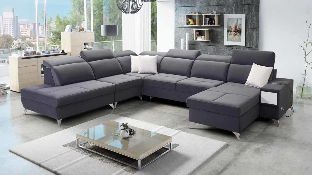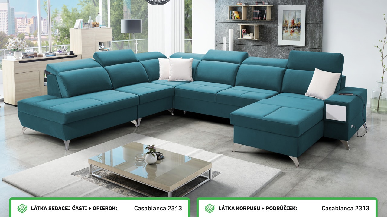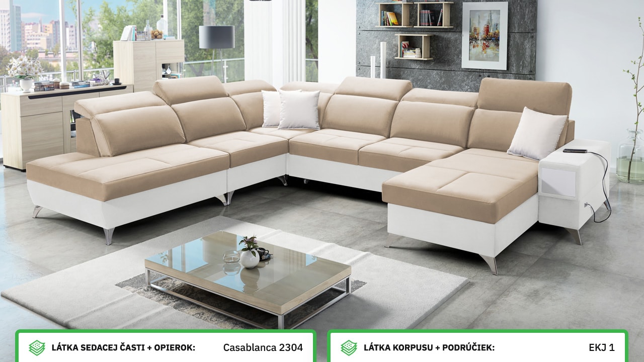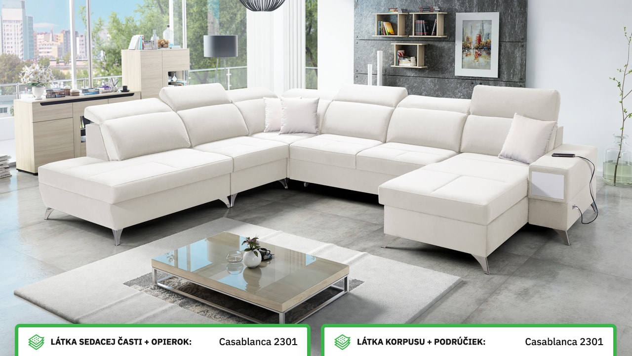 Táto veľmi veľká a priestranná sedacia súprava do tvaru U pohodlne usadí celú vašu rodinu. Je vhodná do viacčlennej domácnosti, kde si na nej všetci spolu oddýchnu a poleňošia. Má nastaviteľné opierky hlavy, USB porty na nabíjanie, vstavaný šuplík v bočnej opierke a úložný priestor rozdelený až do troch častí. Po rozložení poskytne naozaj veľkú spaciu plochu. Typ nožičiek, farbu poťahovej látky aj dizajn šuplíku si môžete nakonfigurovať sami podľa svojich predstáv.