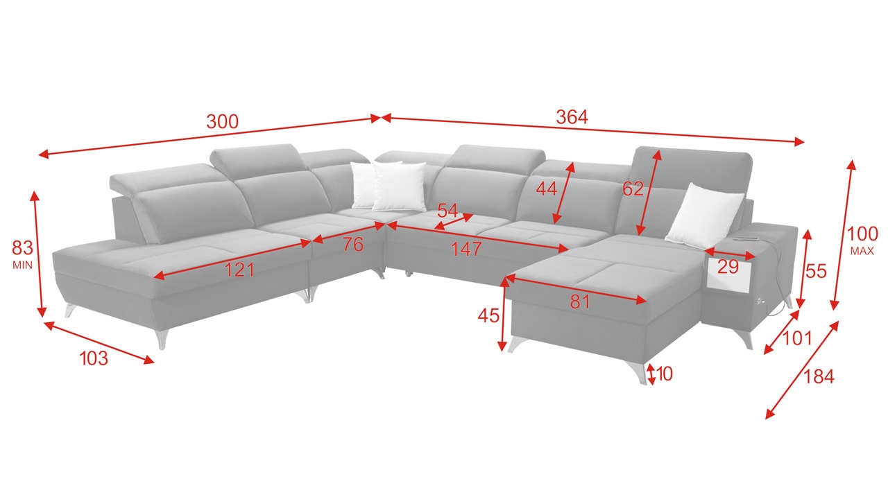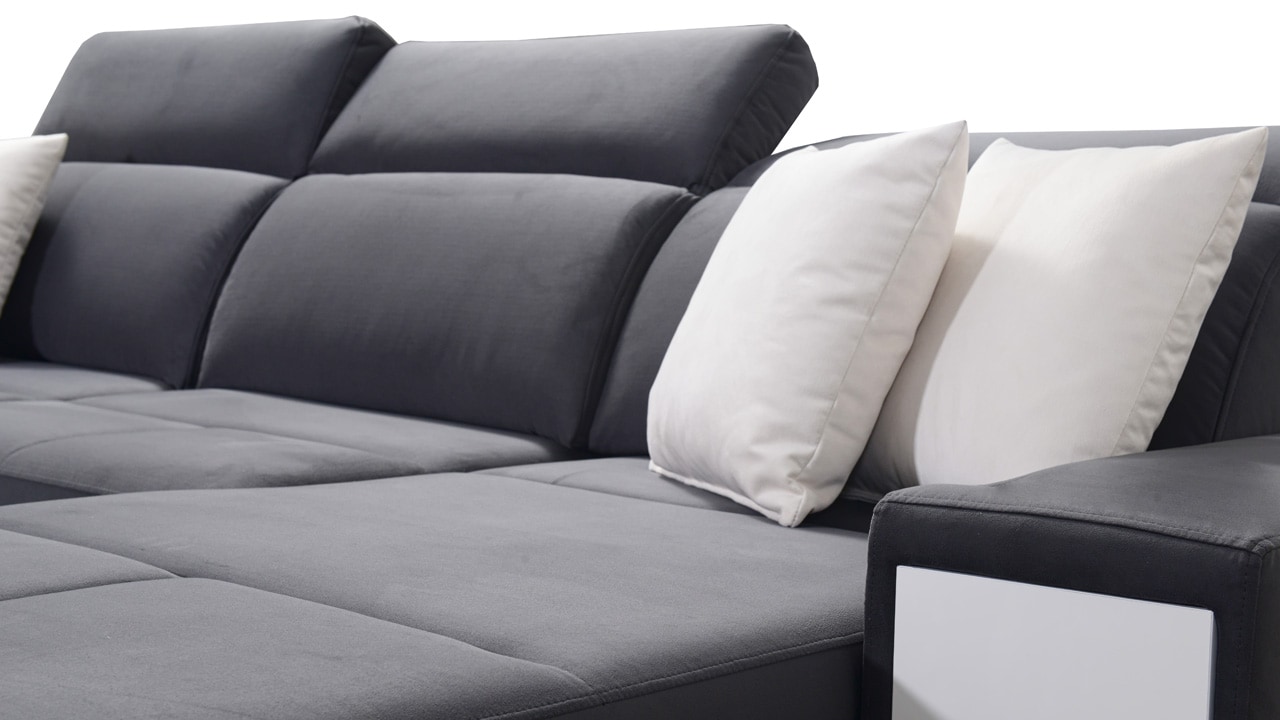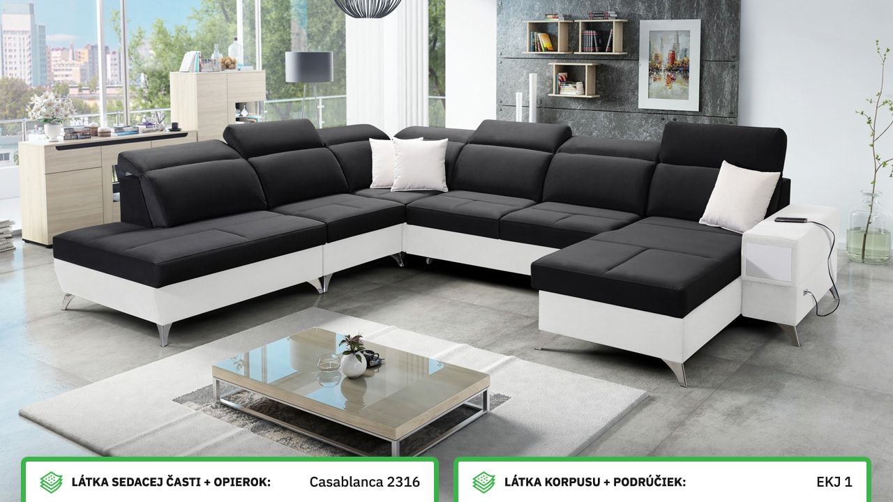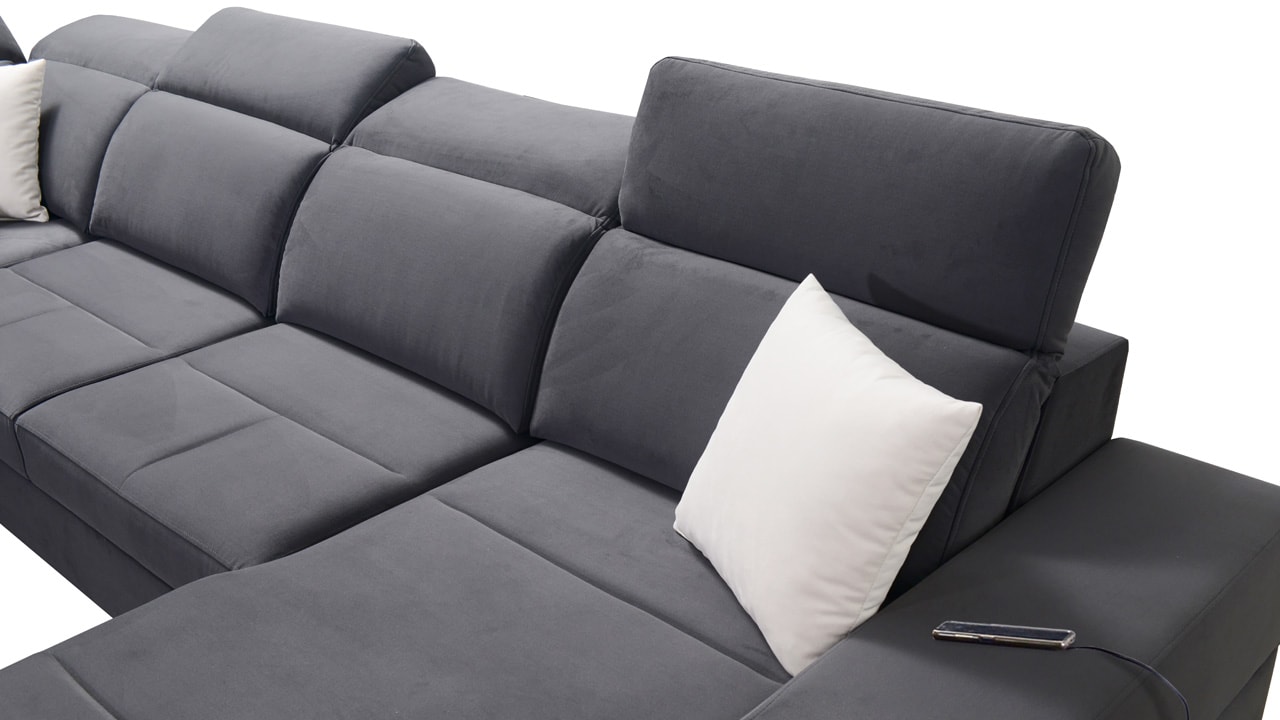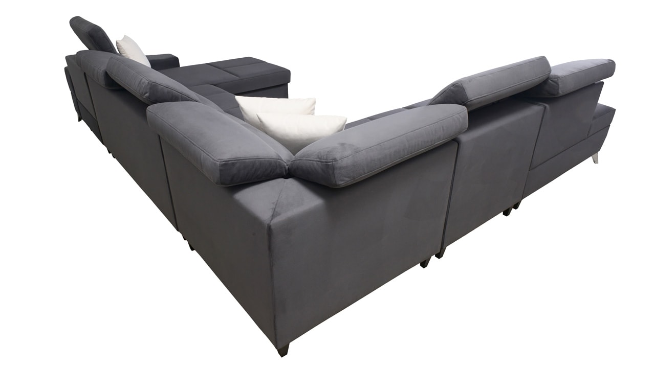 Táto veľmi veľká a priestranná sedacia súprava do tvaru U pohodlne usadí celú vašu rodinu. Je vhodná do viacčlennej domácnosti, kde si na nej všetci spolu oddýchnu a poleňošia. Má nastaviteľné opierky hlavy, USB porty na nabíjanie, vstavaný šuplík v bočnej opierke a úložný priestor rozdelený až do troch častí. Po rozložení poskytne naozaj veľkú spaciu plochu. Typ nožičiek, farbu poťahovej látky aj dizajn šuplíku si môžete nakonfigurovať sami podľa svojich predstáv.