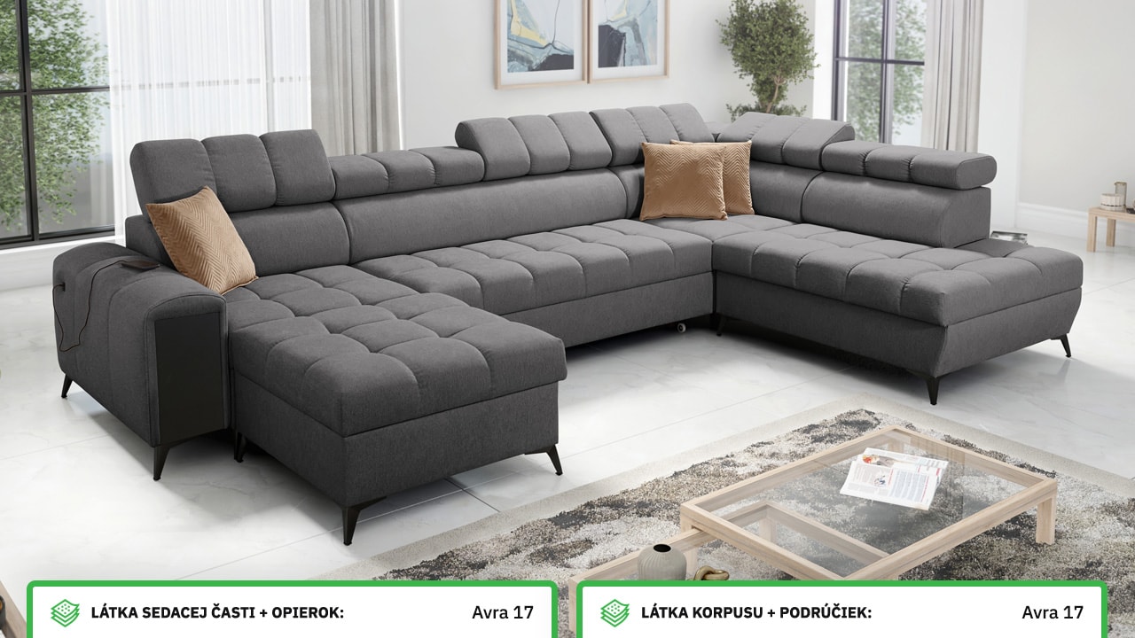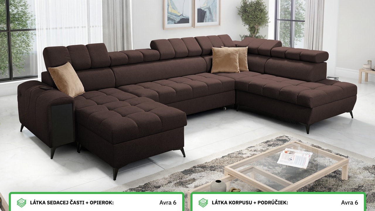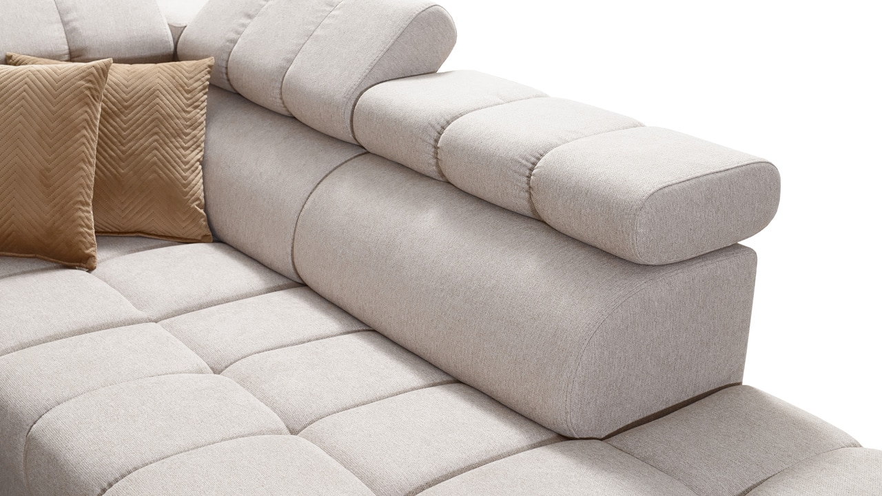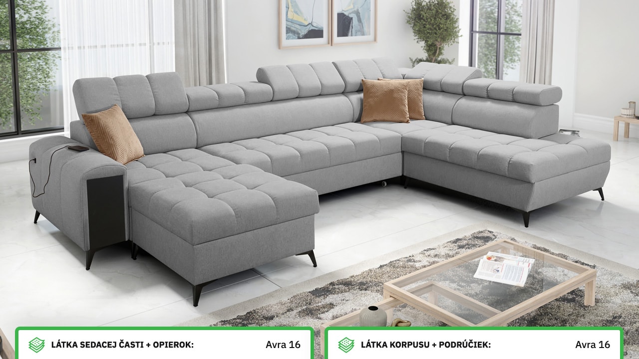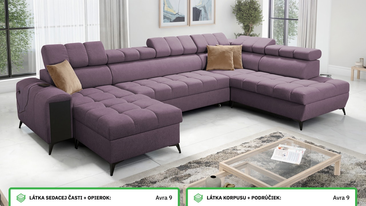 Táto moderná rohová sedacia súprava je navrhnutá tak, aby vám domov priniesla maximálnu pohodu a využitie priestoru. S polohovateľnými opierkami hlavy sa môžete pohodlne usadiť a relaxovať. Úložný priestor vám umožní efektívne využiť každý centimeter vašej obývačky.  Vstavaný minibar zase zaistí, že budete mať všetko po ruke. Čerešničkou je už len fakt, že si sedačku môžete nechať vyrobiť v poťahu podľa vášho vkusu, okrem látok Erie, Bristol a Bahama.