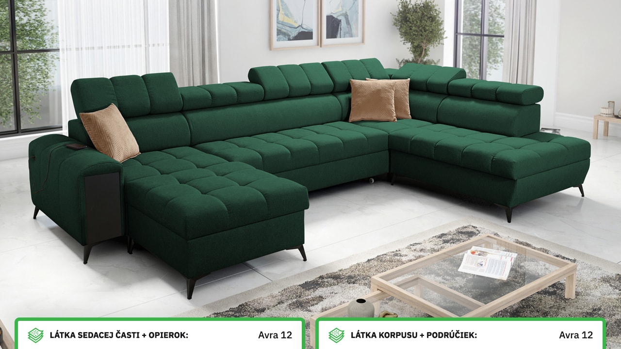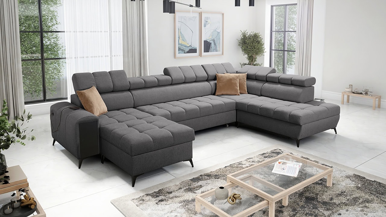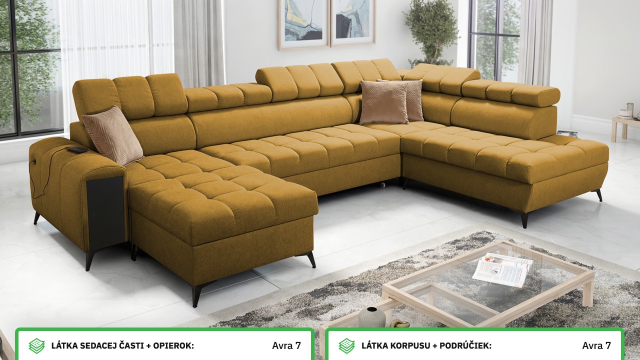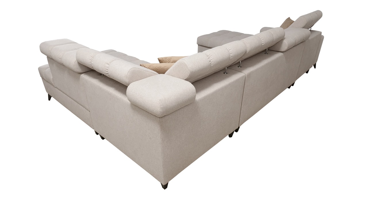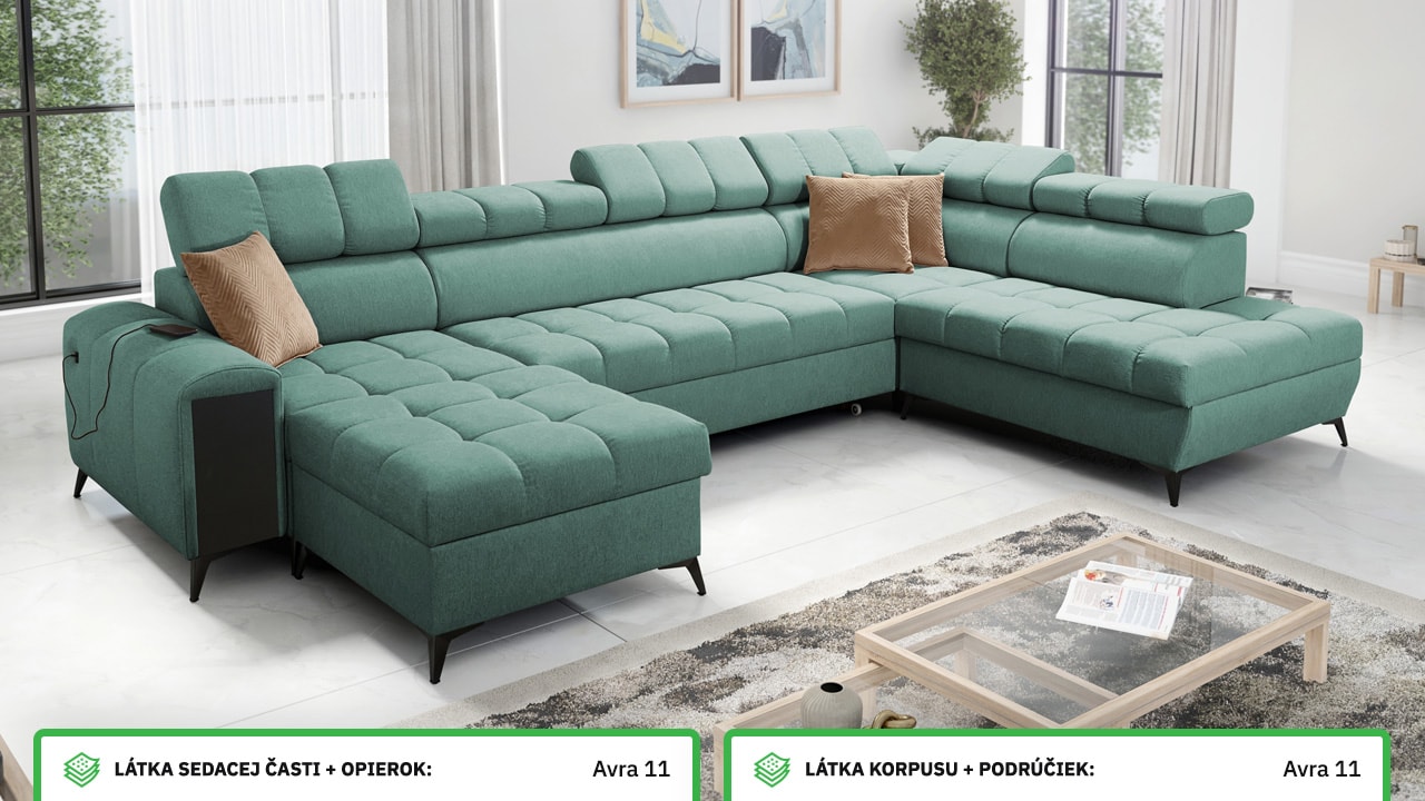Táto moderná rohová sedacia súprava je navrhnutá tak, aby vám domov priniesla maximálnu pohodu a využitie priestoru. S polohovateľnými opierkami hlavy sa môžete pohodlne usadiť a relaxovať. Úložný priestor vám umožní efektívne využiť každý centimeter vašej obývačky.  Vstavaný minibar zase zaistí, že budete mať všetko po ruke. Čerešničkou je už len fakt, že si sedačku môžete nechať vyrobiť v poťahu podľa vášho vkusu, okrem látok Erie, Bristol a Bahama.