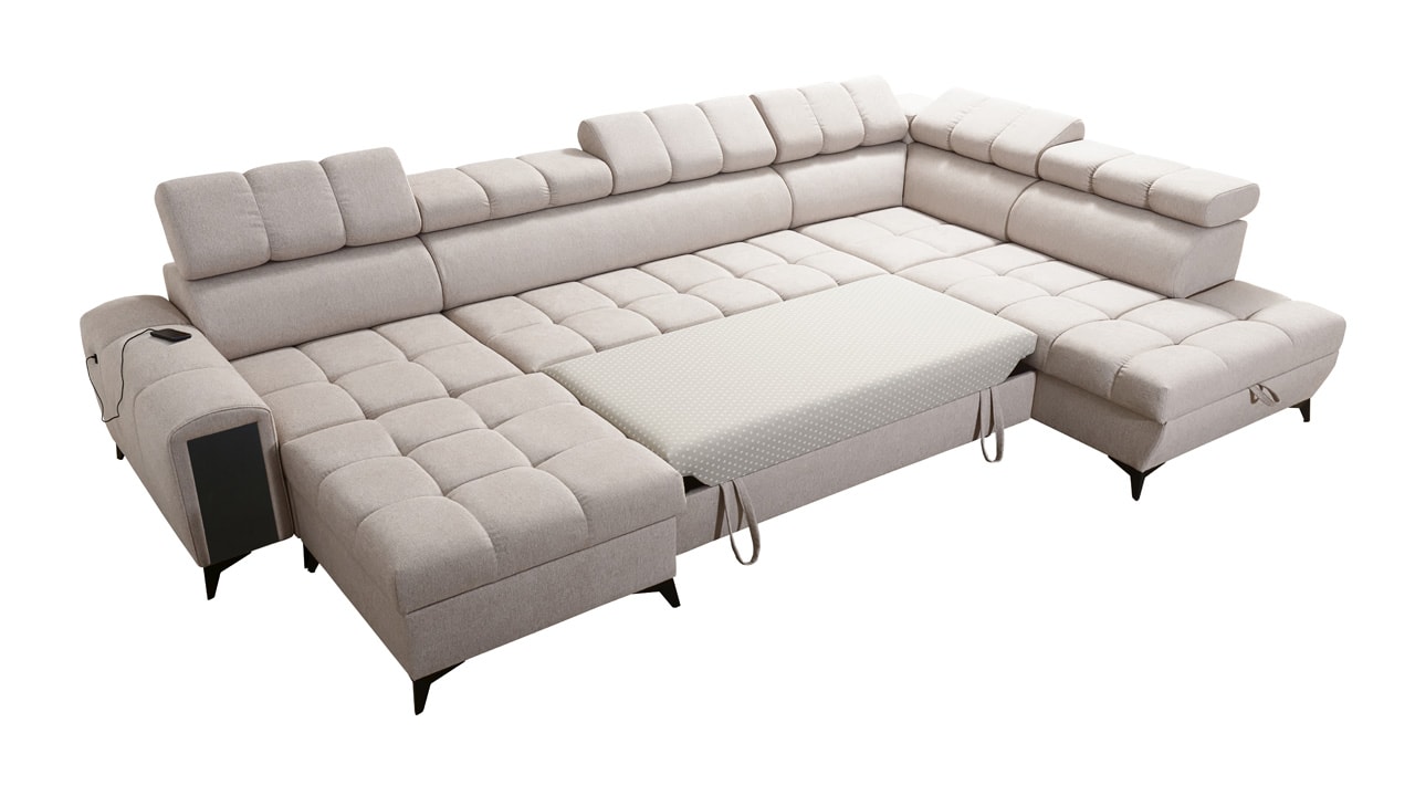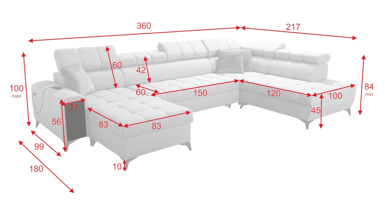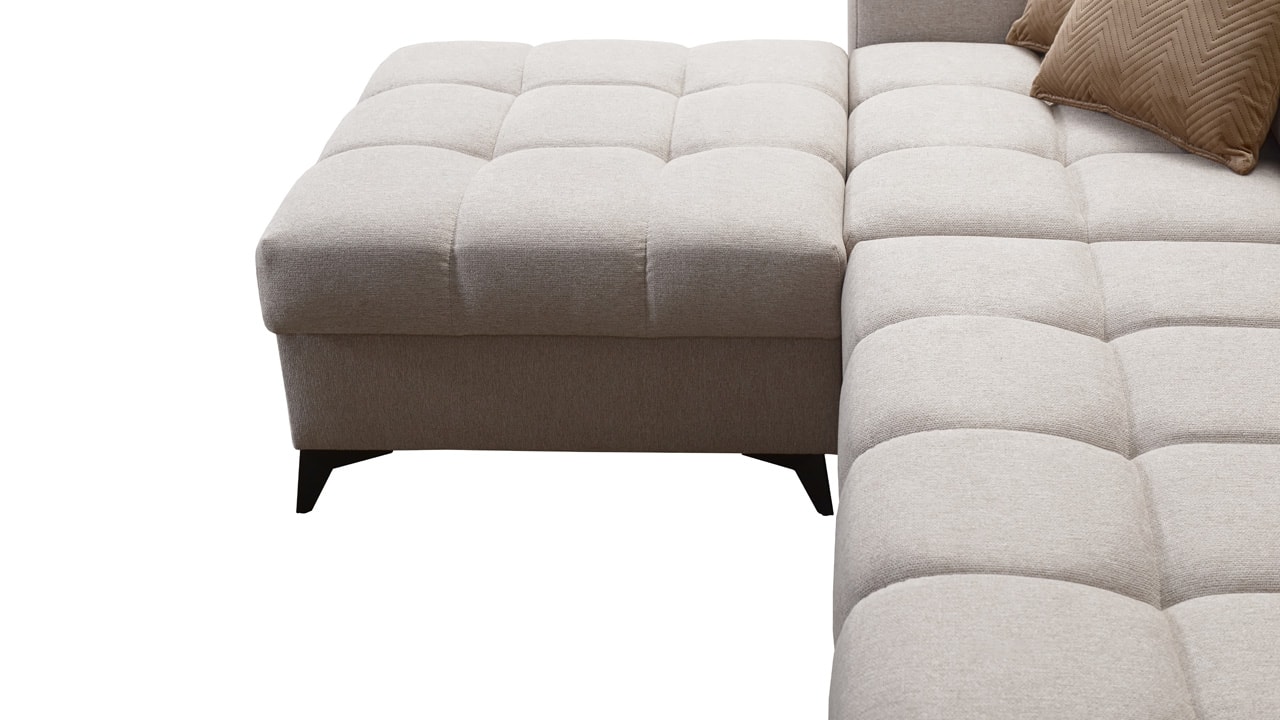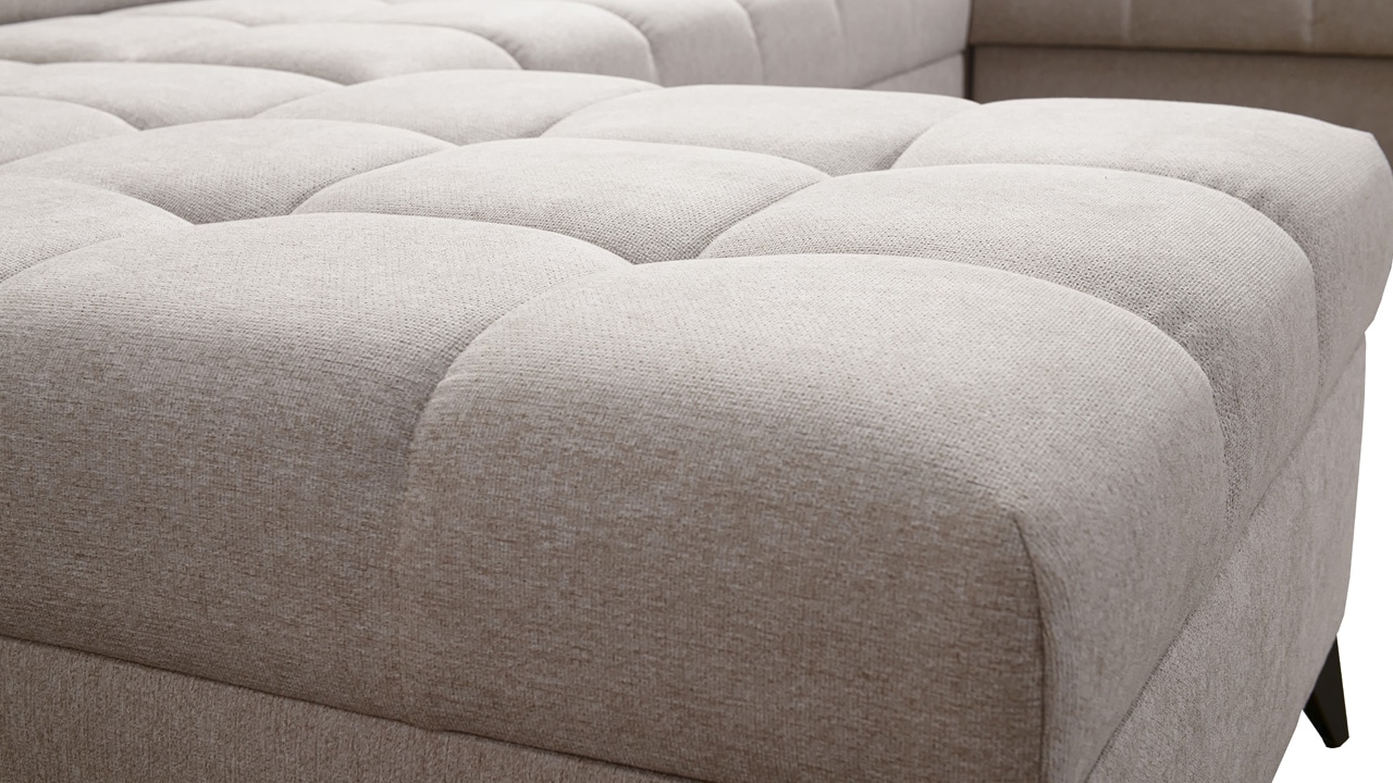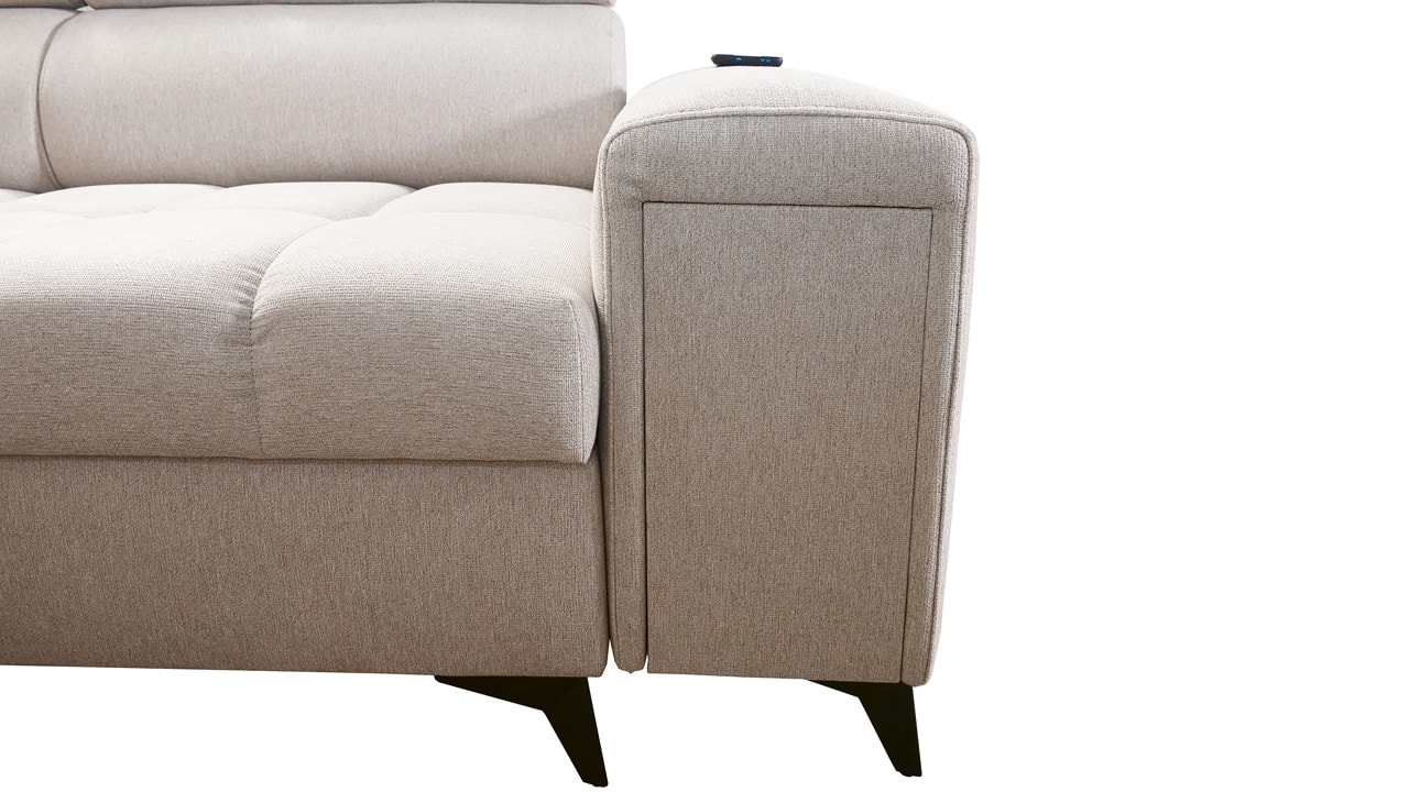 Táto moderná rohová sedacia súprava je navrhnutá tak, aby vám domov priniesla maximálnu pohodu a využitie priestoru. S polohovateľnými opierkami hlavy sa môžete pohodlne usadiť a relaxovať. Úložný priestor vám umožní efektívne využiť každý centimeter vašej obývačky.  Vstavaný minibar zase zaistí, že budete mať všetko po ruke. Čerešničkou je už len fakt, že si sedačku môžete nechať vyrobiť v poťahu podľa vášho vkusu, okrem látok Erie, Bristol a Bahama.