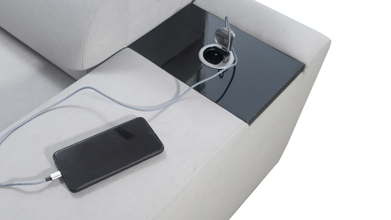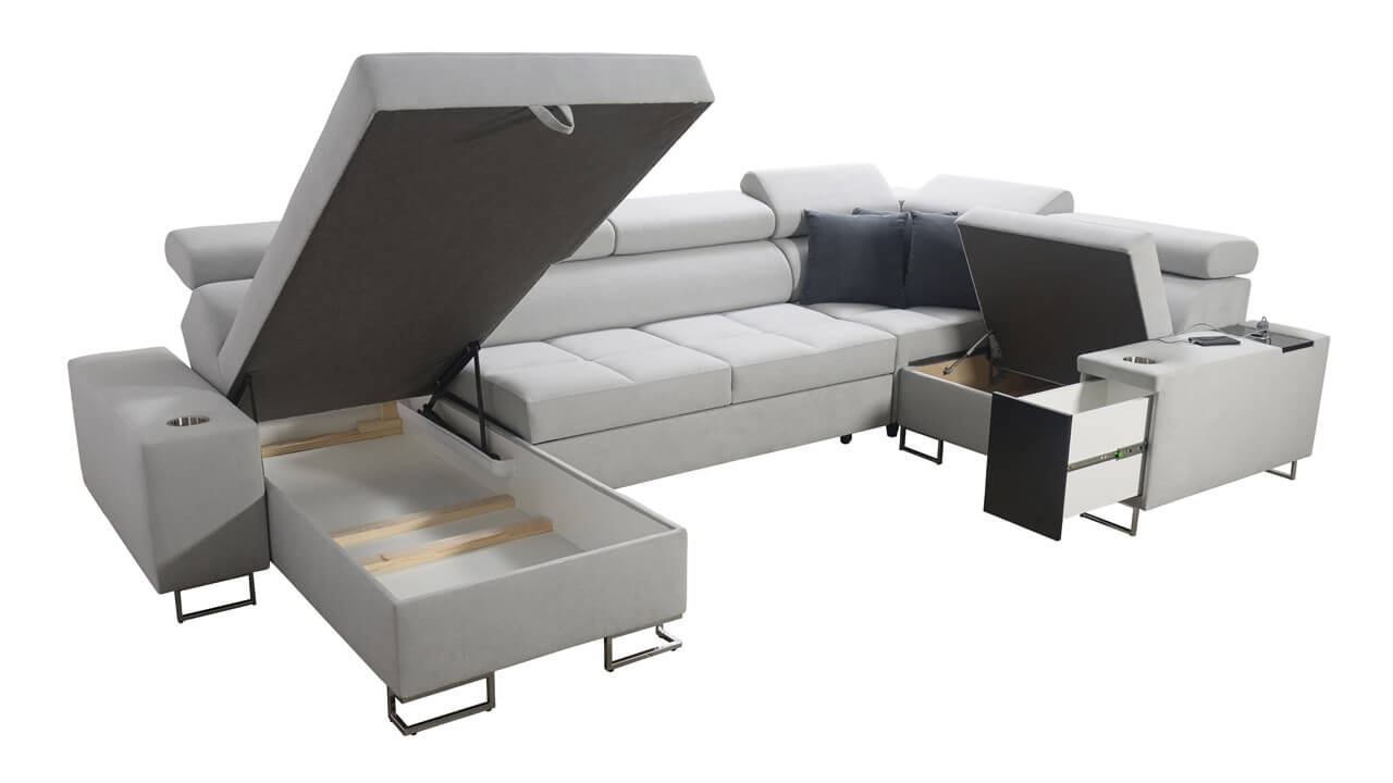 Veľká a priestranná U sedacia súprava, na ktorej si zaručene oddýchnete. Má všetko, čo vám pomôže k tomu najvyššiemu komfortu: pevné sedenie, polohovateľné opierky hlavy, vstavaný minibar, držiaky na poháre a dokonca aj vstavanú nabíjaciu stanicu so zásuvkou a USB portom. Je totožná s modelom Murena IV Mini, no má o niečo väčšie rozmery.