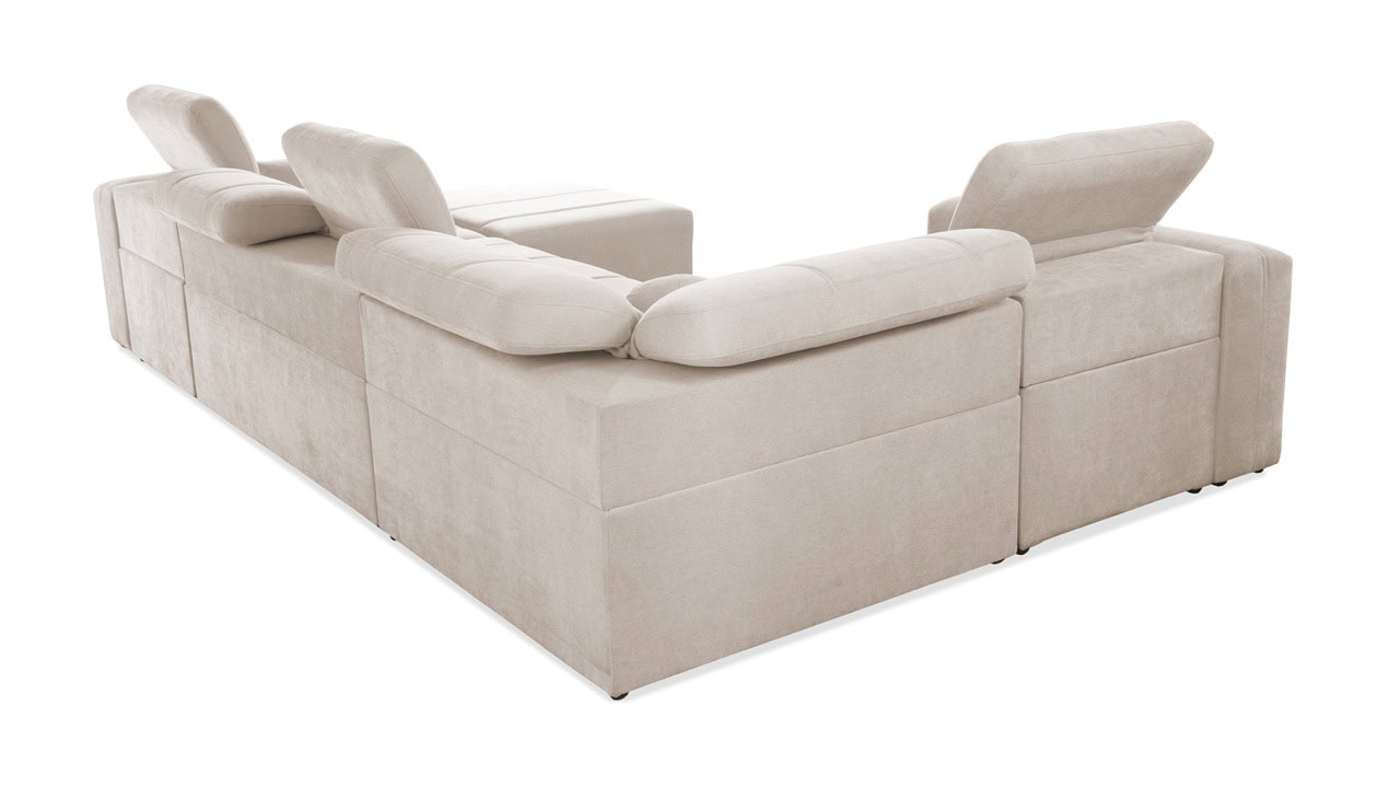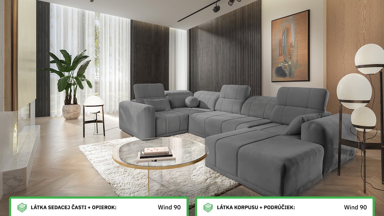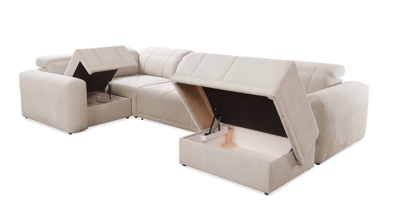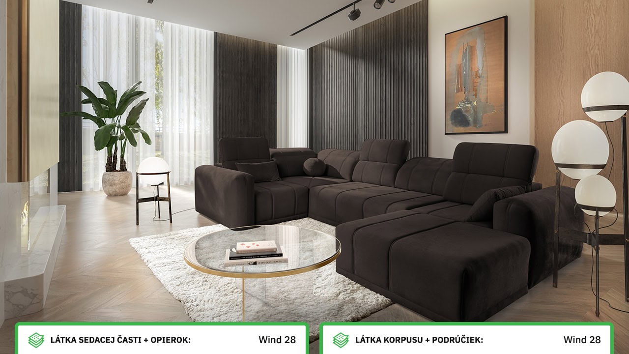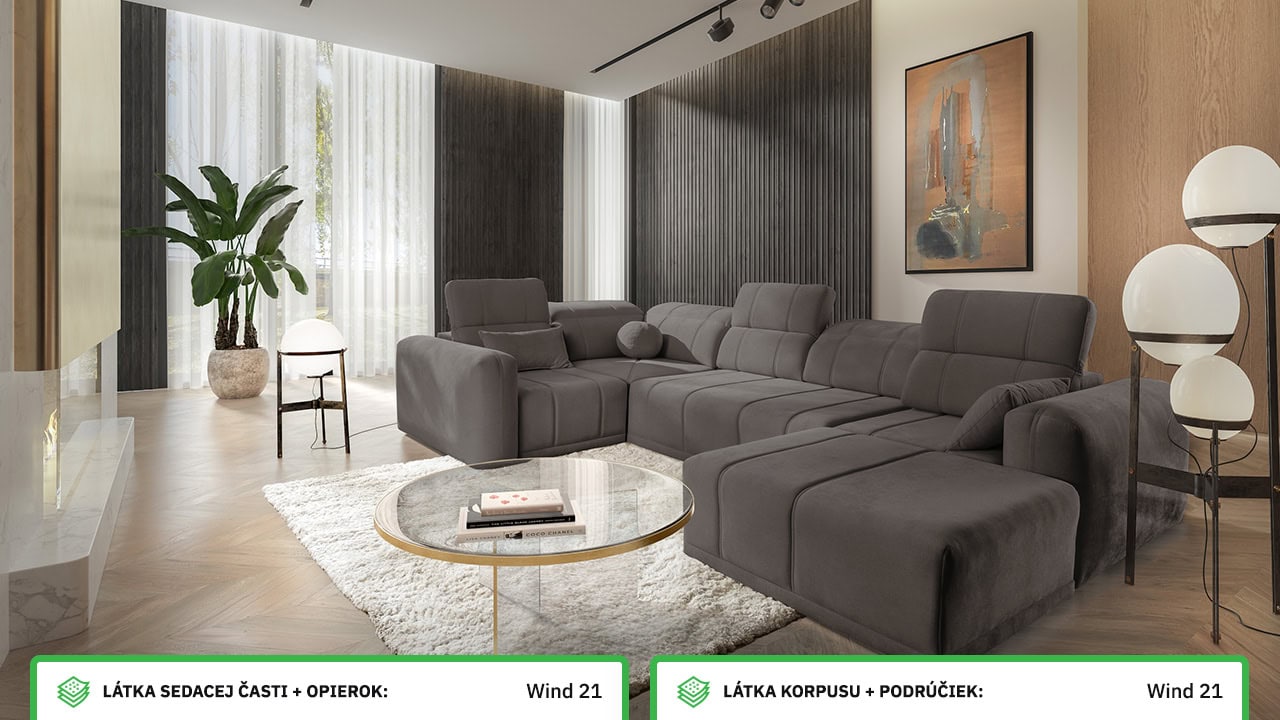 Vytvorte si v obývačke priestor na zábavu a oddych s našou sedačkou v tvare U. Sedačka je vyrobená z kvalitných materiálov a ponúkne vám praktický úložný priestor či možnosť rozkladania. Pohodlie pri sedení zvyšuje posúvateľná opierka chrbta a polohovateľné opierky hlavy. Na pohľad vás očarí vás zaujímavým detailom šitia i moderným dizajnom. Strávite na nej príjemné chvíle s rodinou či priateľmi pri filme, rozhovore alebo spoločenských hrách.